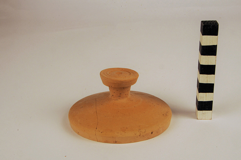 coperchio di pisside acroma caratterizzato da corpo troncoconico con alto pomolo troncoconico; due frammenti pertinenti a fondo e parete di pisside
