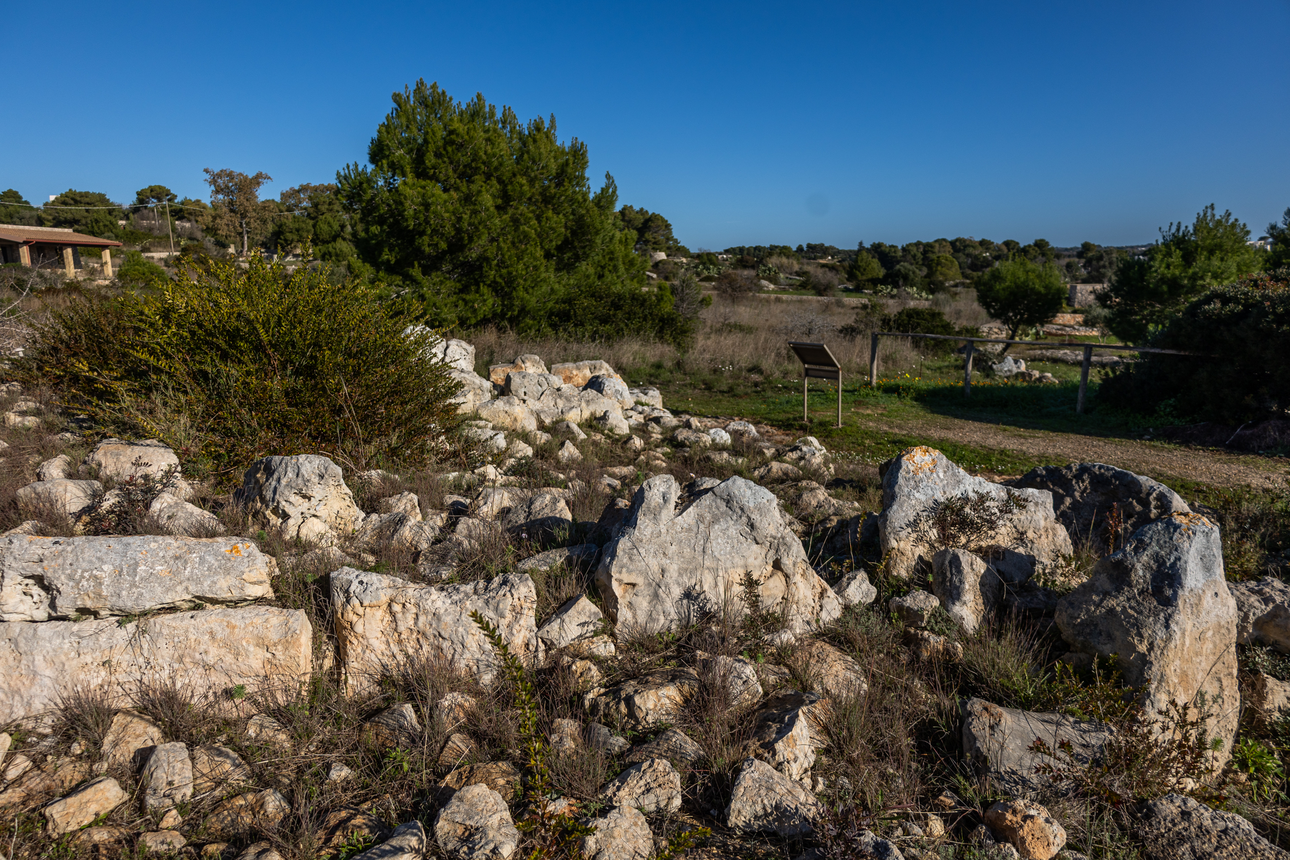 Si tratta di 90 accumuli di pietre e terra di varie forme ed estensioni, con diametri compresi in media tra gli otto e i dieci metri - con alcune eccezioni che superano i 20 metri - e un’altezza di 50-60 centimetri, al massimo 1 m: alcuni appaiono più compatti e con una struttura conica a base circolare, altri più espansi e con un perimetro ovoidale e trapezoidale. L’analisi delle tipologie ceramiche e di alcuni resti ossei ha permesso di collocare il sito tra la metà del IV e il III millennio a.C. in accordo con il diffondersi di una pratica funeraria - quella del seppellimento sotto tumulo - estesa dal nord Europa fino alla Puglia meridionale, all’interno di un processo di interazione culturale. Complessivamente ne sono stati indagati dodici, di cui tre non hanno restituito informazioni di carattere archeologico, trattandosi di spietramenti recenti. Per il resto, si distinguono due differenti tipologie di monumenti, quelli di carattere cultuale, il tumulo 2 (5 x 4 metri) e il tumulo 4 (8 x 5 metri), entrambi di forma allungata, che hanno restituito frammenti ceramici e strumenti in pietra, e quelli utilizzati come strutture sepolcrali, caratterizzate dalla presenza di resti umani combusti entro vasi e/o resti inumati affiancati da corredo ceramico, deposto solitamente su una piattaforma di grandi blocchi, e successivamente coperti di pietra e terra. Nello specifico, il tumulo 1 (lungo 10 metri, largo sei e alto 60 centimetri), a 300 metri sud-ovest della Masseria Don Cesare, e il tumulo 6, a 700 metri da quest’ultimo, in località l’Aparo di Valentini, con un profilo circolare (diametro 10 metri e altezza 60 centimetri), documentano il ricorso alla pratica di impilare tre vasi uno nell'altro prima della loro deposizione in una zona marginale del tumulo: il primo conservava, all’interno di un vaso decorato con motivo a fasci incisi, resti combusti di minimo due individui, una donna e un bambino; nel secondo, erano i resti combusti e inumati di almeno cinque individui, di cui tre adulti, un giovane e un bambino, sparsi in parte nella zona centrale, apparentemente senza ordine, e in parte in alcuni vasi frammentari. Un osso umano del tumulo 6 è stato datato al 2600-2300 a.C. Nel tumulo 9, di forma ellittica, furono recuperati resti umani, di cui uno combusto, deposti in una zona centrale, poco sotto la superficie. Oltre ai resti umani erano circa 300 frammenti ceramici di cui uno datato al 2.702-2.474 a.C. Il tumulo 68 è, finora, il tumulo più antico della necropoli: lungo 8,90 m, largo 6,30 m, alto 60 cm ha una pianta trapezoidale e ha restituito una buca delimitata da lastre e una cista litica contenente resti umani cremati di cui uno datato al 3.650-3500 a.C. Il tumulo 10, lungo 11 m, largo 5,5, alto 1 m è una struttura triangolare articolata in 3 ambienti con resti di incinerati deposti in vasi: in un caso, tre vasi impilati contenevano i resti cremati di un adulto datato al 3020- 2680 a. C. Di particolare interesse, per le sue dimensioni, il tumulo 11: lungo 22 m, largo 18, alto 1 m, il monumento fu costruito su un’area sopraelevata. Esso ha restituito una cista litica con ossa cremate e frammenti ceramici e circoli di pietre con al centro un’urna cineraria contenente i resti di un adulto datato al 3090-2900 a.C. Il tumulo 7, il più monumentale, è caratterizzato da una complessa articolazione degli spazi: esteso 200 metri quadri e di forma trapezoidale presenta un muro di grandi blocchi lungo 14 metri che separa l’area di rispetto con valenza cultuale da quella funeraria vera e propria caratterizzata da una cista litica ubicata all'estremità orientale della struttura. Si tratta di un ambiente di forma rettangolare (1,60 x 1,35 metri spazio interno; 2,30 x 2 metri ingombro esterno; profondità 150 centimetri) chiuso su tre lati da grandi lastroni e sul lato ad est da tre massi rimovibili. Al suo interno, nella parte più in bassa è documentata l’incinerazione entro vasi di tre individui di cui due datati al 2910-2630 a.C.; successivamente la tomba fu usata per la deposizione secondaria di minimo 50 individui, di cui 35 adulti di entrambi i sessi e 15 immaturi di età compresa tra i 0 e 19 anni: da un osso proviene la datazione di un osso al 2480-2280 a.C. Altri resti umani vennero messi in luce in una struttura al di là del muro di divisione, di forma quadrangolare e perimetrata da cinque massi: in particolare, un femore e denti umani, per un totale di minimo tre individui, che testimoniano un suo ipotetico utilizzo come luogo di deposizione e scheletrizzazione dei defunti. Al centro del tumulo è stata rinvenuta una buca circolare con pietre piatte disposte in quattro filari contenente resti di terra, ceneri, ossa bruciate e parte di un vaso. Una funzione cultuale fu rivestita anche da un’altra buca di forma circolare trovata a sud del muro, delimitata da otto lastre, e contenente terra bruciata e una saliera rotta intenzionalmente. La frantumazione intenzionale del corredo ceramico e la dispersione dei suoi frammenti è una pratica ampiamente diffusa nell’età del Rame dell’Italia centro-meridionale e documenta un’interazione culturale tra i gruppi Laterza, Gaudo e Rinaldone. Accanto alla ceramica, di cui si conservano in particolare forme per bere e scodelle basse e aperte per il consumo di cibi o per pratiche cerimoniali, la cista conteneva anche altri manufatti, come ornamenti in pietra, osso, conchiglia e corallo; strumenti in calcare (due asce a ferro da stiro) furono deposti, uno accanto all’altro, su un margine del tumulo. Il materiale ceramico è riferibile alle facies Laterza e Gaudo: alla prima si riferiscono i boccaletti, le patere, i recipienti decorati a bande campite a reticolo; alla seconda le brocche con decorazione a fasci di linee incise