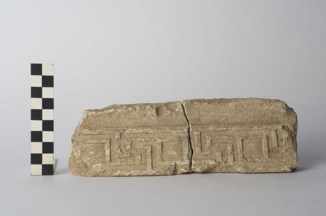 due frammenti di sima in calcare decorati con motivo a meandro