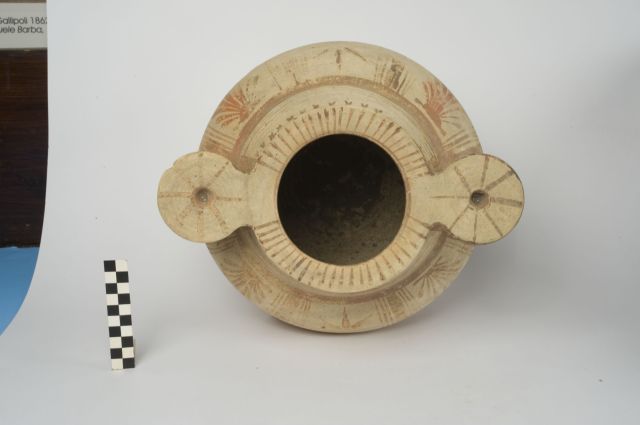 Orlo a tesa orizzontale; collo troncoconico; corpo globulare leggermente depresso; piede a disco distinto; anse a fungo; decorazione in bruno, in parte abrasa: sull'orlo e sule anse motivi a stella e a raggi; fasce brune e coppie di linee definiscono quadri metopali sul collo, campito da foglie cuoriformi, sulla parte centrale del corpo, campito con motivo a stella a sei punte e palmette; nella parte inferiore coppie di linee parallele