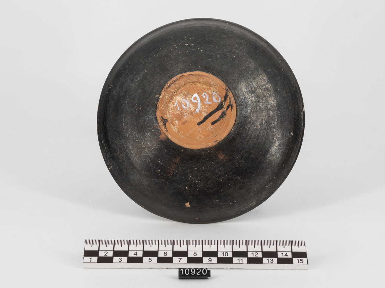 Basso piede ad anello, bacino rigonfio e poco profondo, orlo piatto. Vernice nera lucente con riflessi metallici risparmiata all'interno del piede. Argilla rosa fine, depurata