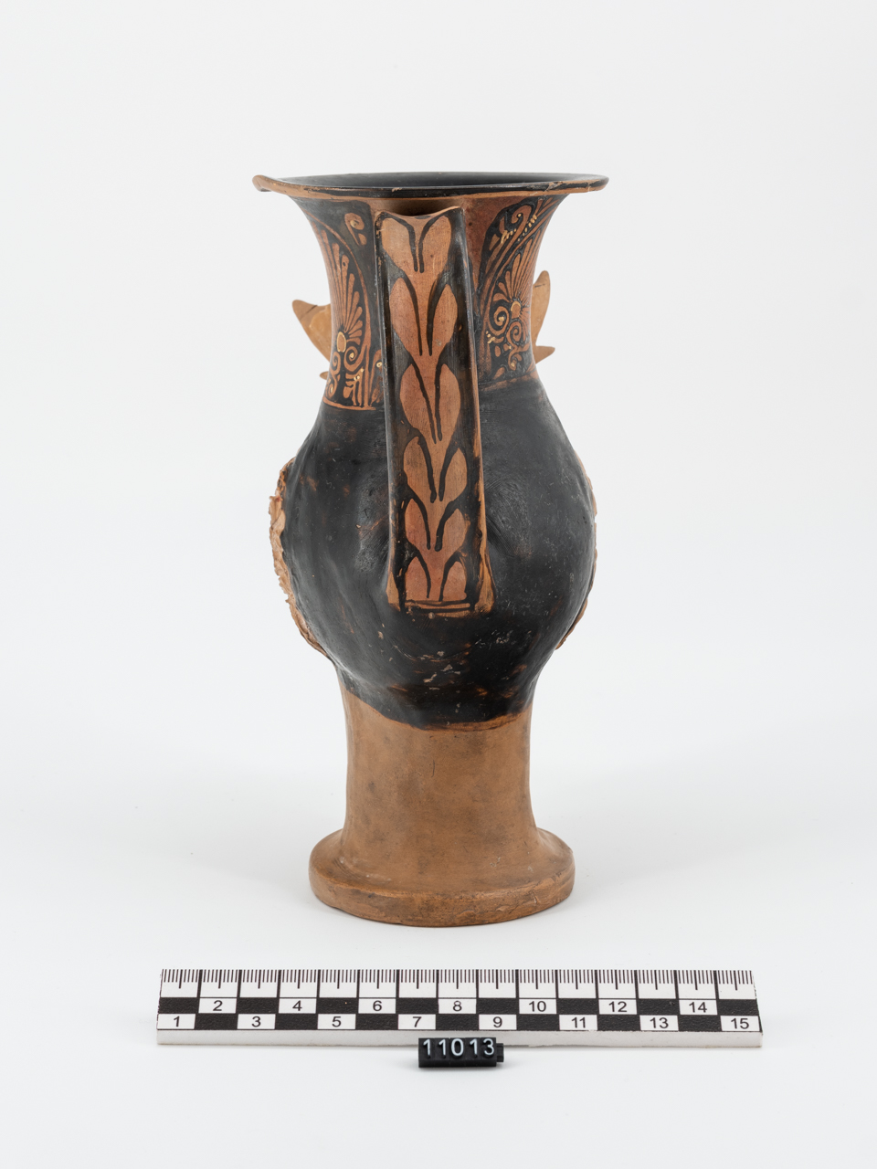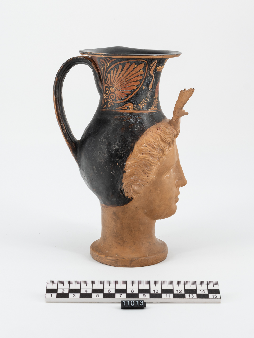 Rhyton in argilla rosa fine, compatta, ben lisciata. Corpo configurato a testa di Atteone accuratamente modellata; sulla fronte corna ramificate; la nuca e la parte posteriore della testa a vernice nera; sulla sommità alto collo a calice; fra nuca e testa ansa verticale a nastro insellato. Sul collo decorazione a figure rosse