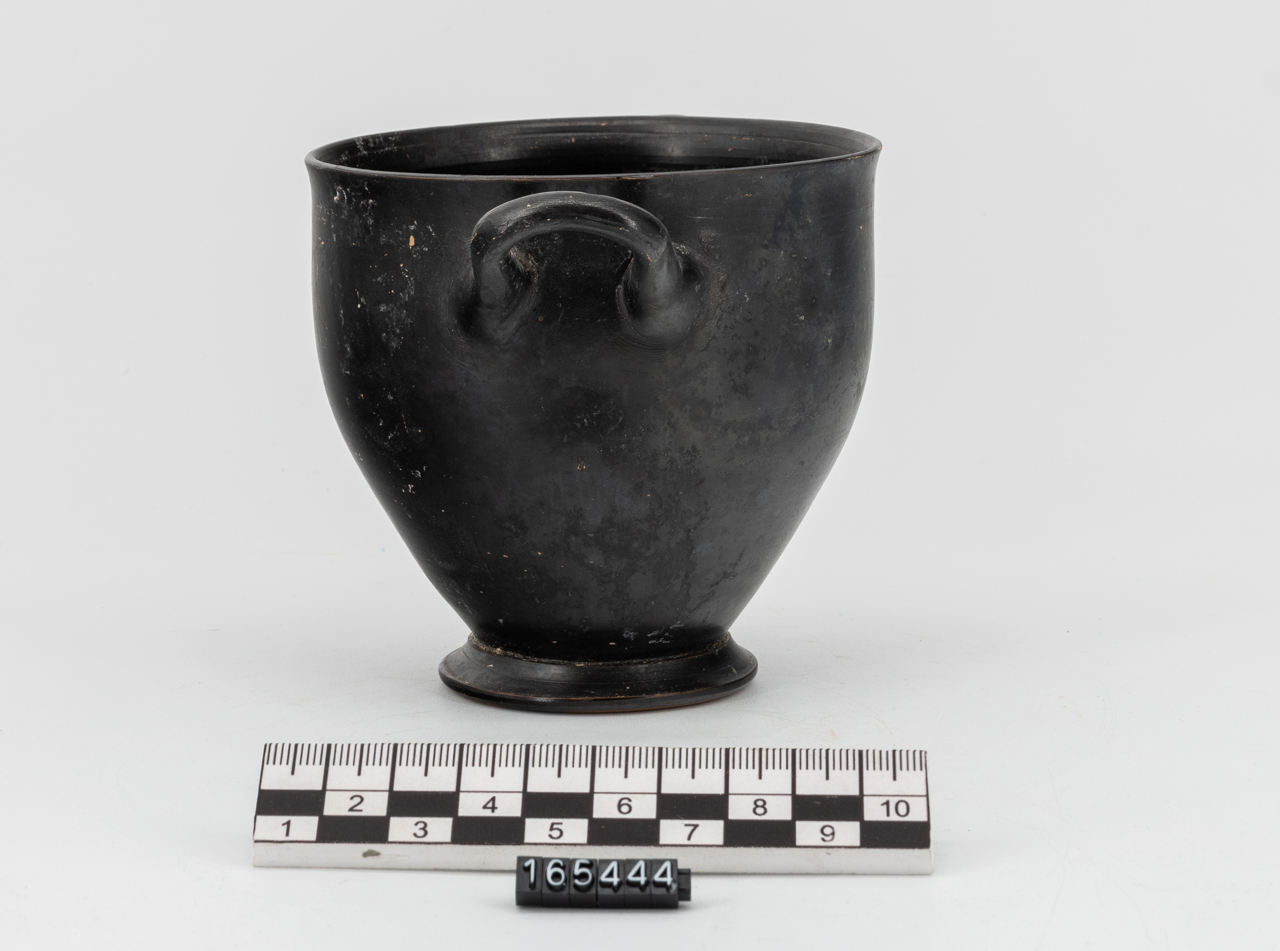 Skyphos di imitazione attica, in argilla depurata, con orlo estroflesso, corpo cilindrico rastremato in basso, piede troncoconico, anse a bastoncello oblique. A risparmio dalla vernice nera parte del piede