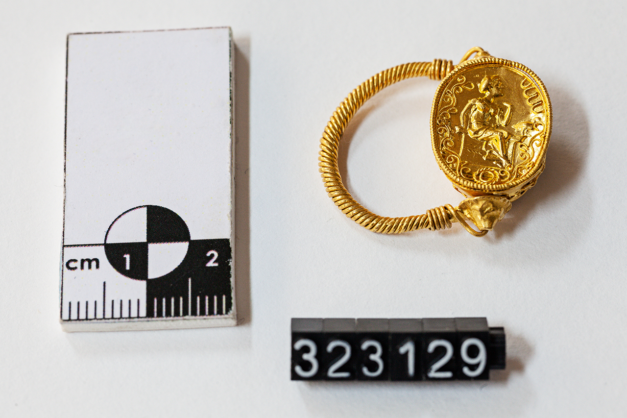 Anello sigillo con verga a filo intrecciato, estremità a calotta configurate, con filo inserito che regge il castone mobile a forma di scarabeo, con decorazione a sbalzo