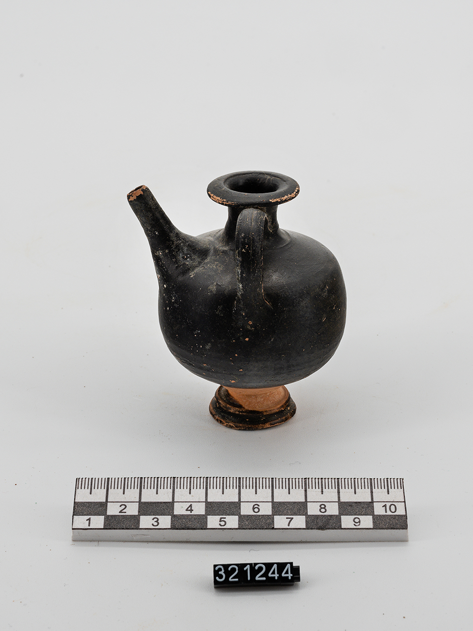 labbro a tesa orizzontale, collo convesso, corpo globulare, piede troncoconico con gola d'attacco, ansa a nastro verticale, beccuccio impostato obliquamente sulla spalla; vernice nera risparmiata all'attacco del piede