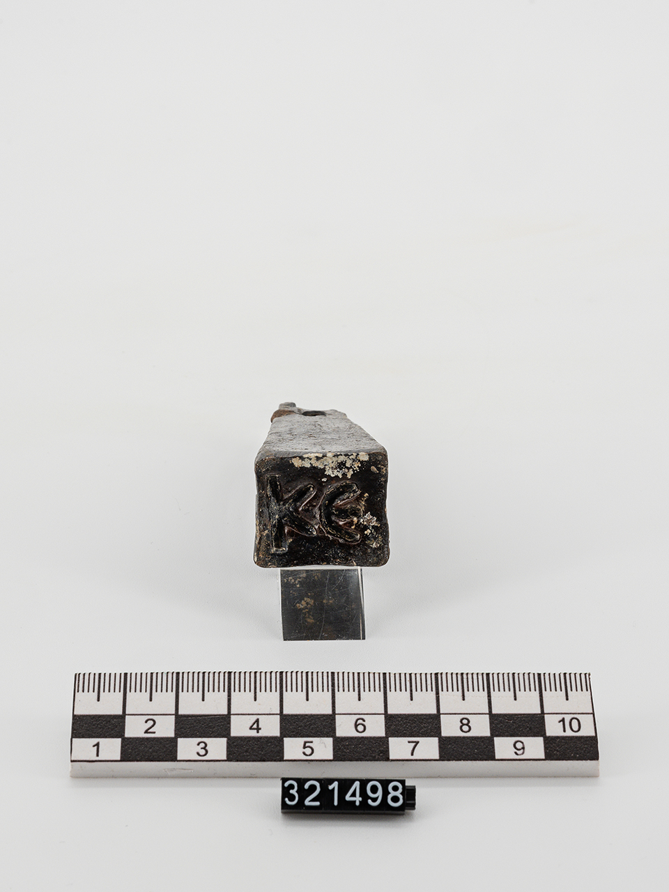 corpo troncopiramidale a base quadrata, foro di sospensione sotto la base minore; sulla base maggiore lettere incise KE