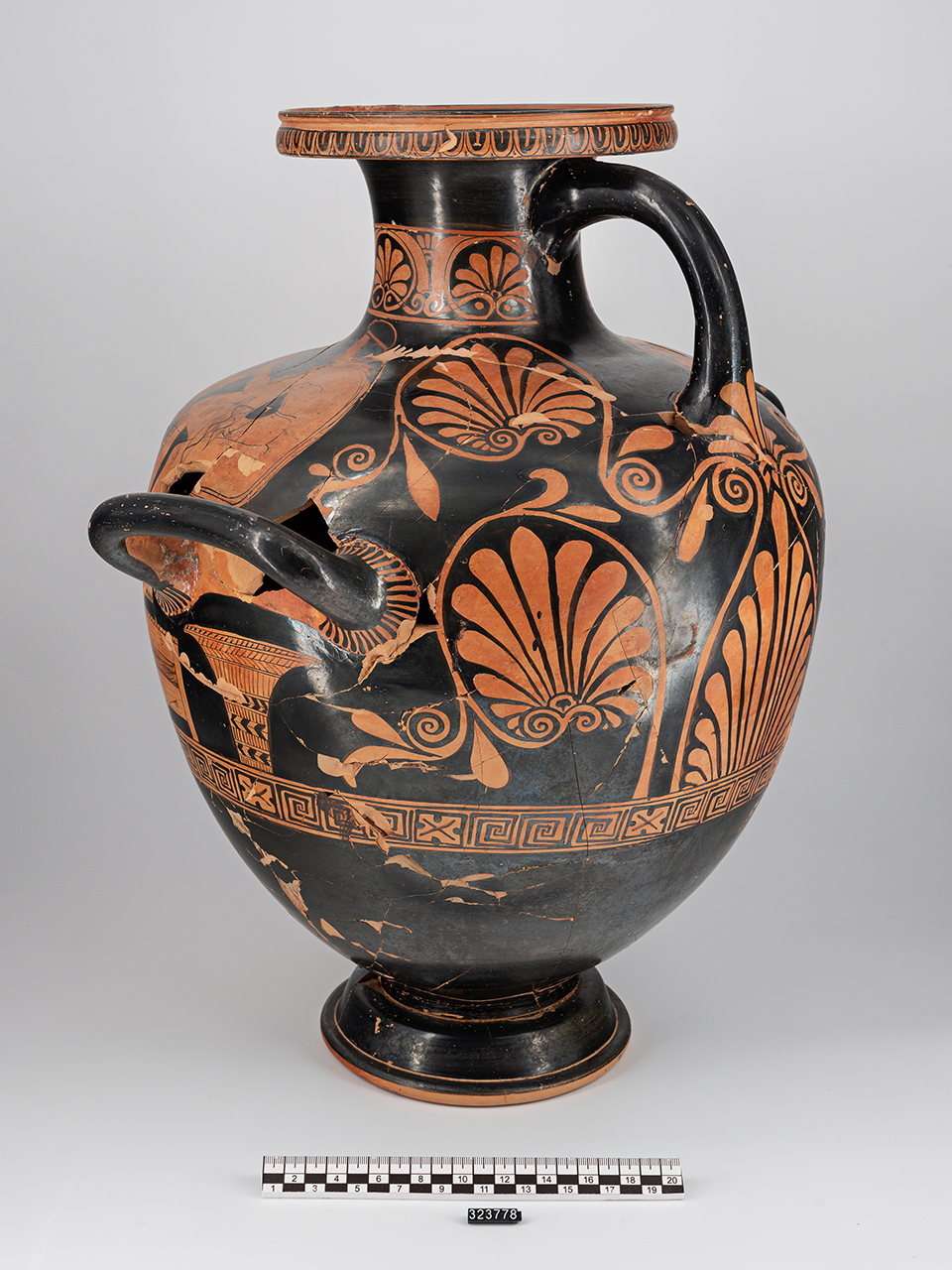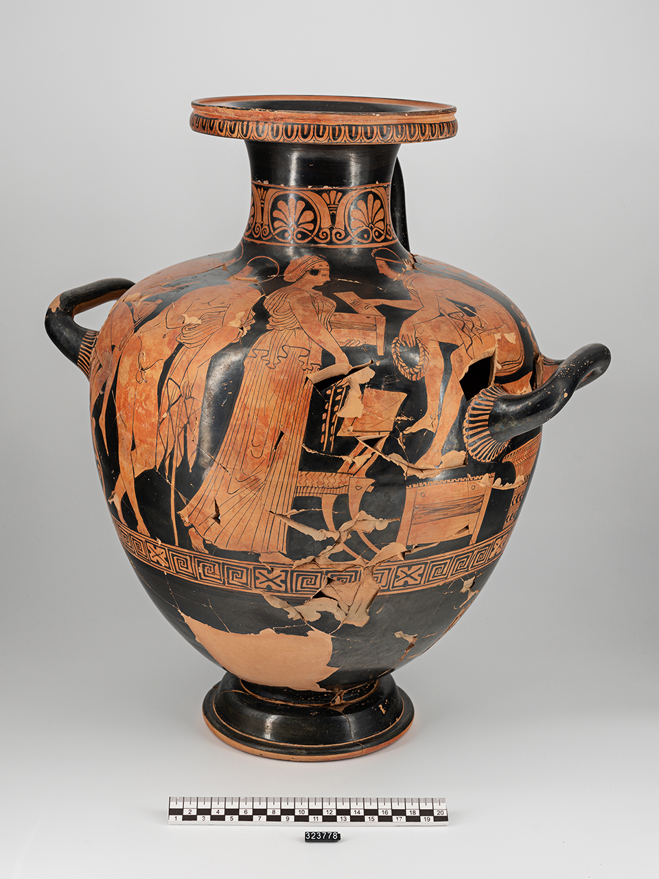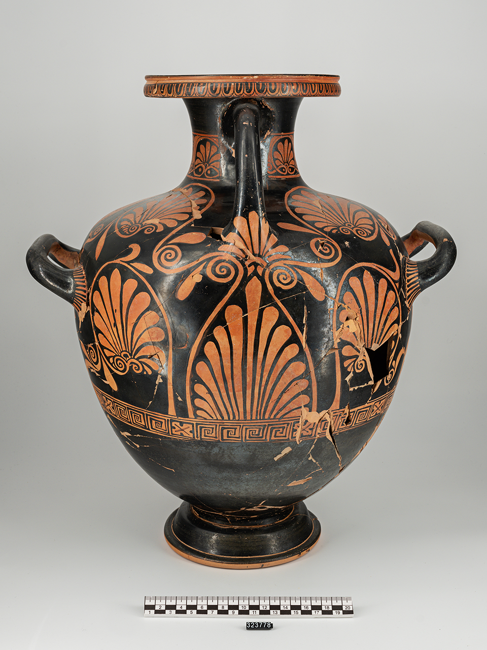 Hydria con labbro estroflesso e modanato, collo concavo, corpo ovoidale con spalla distinta, piede troncoconico modanato, anse a bastoncello, una verticale tra collo e spalla, due oblique sul corpo