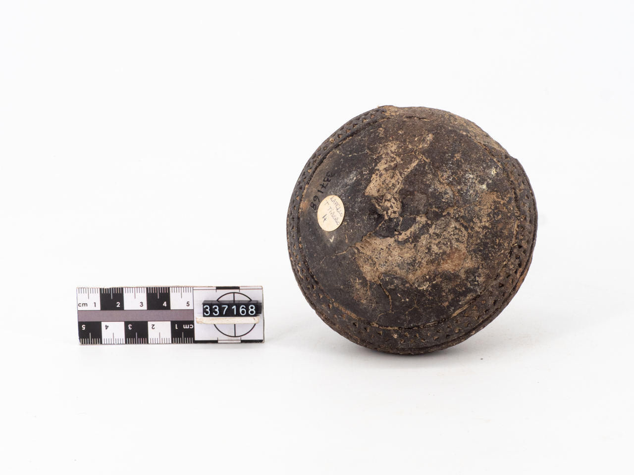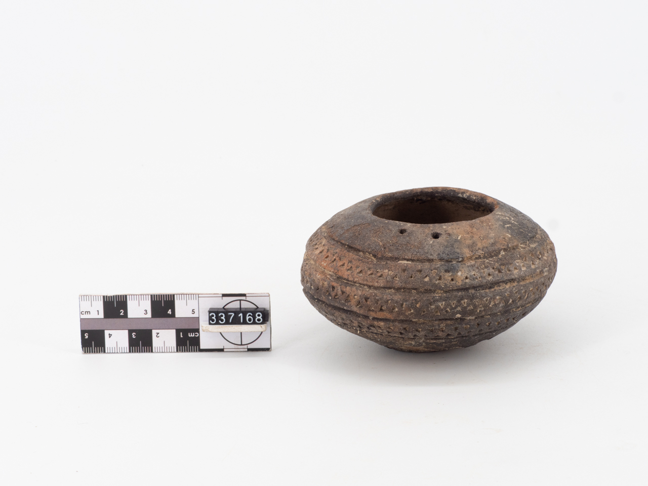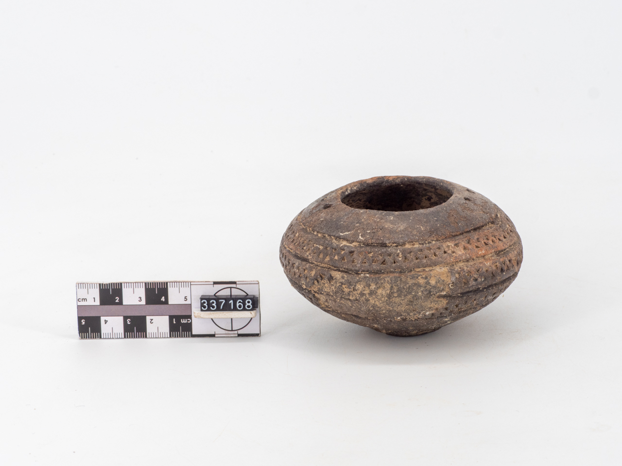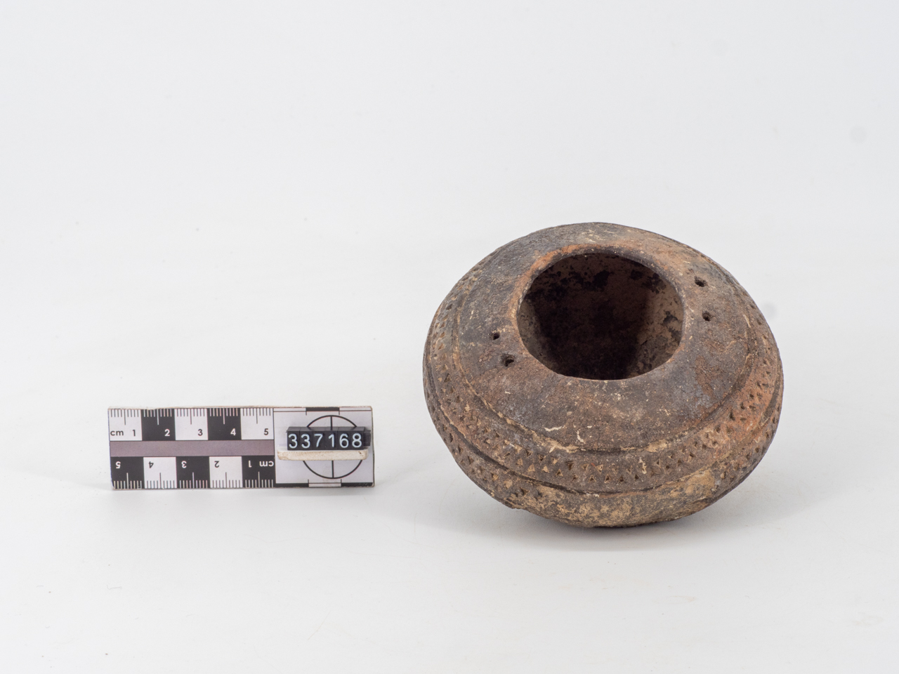 Ciotola ovoidale in impasto bruno pertinente alla facies appenninica; orlo indistinto con due fori passanti; fondo ombelicato; decorazione con triangoli excisi su tre file