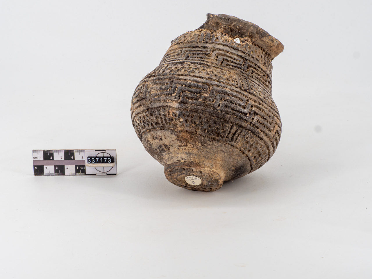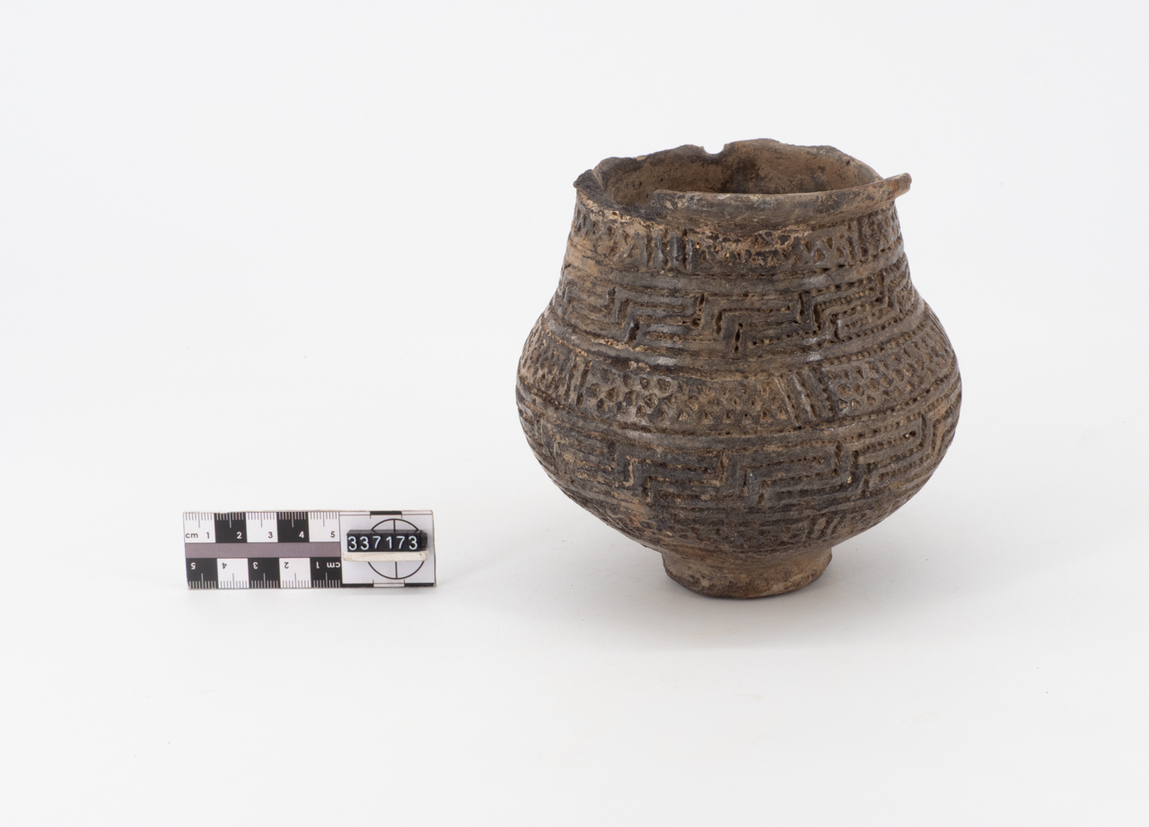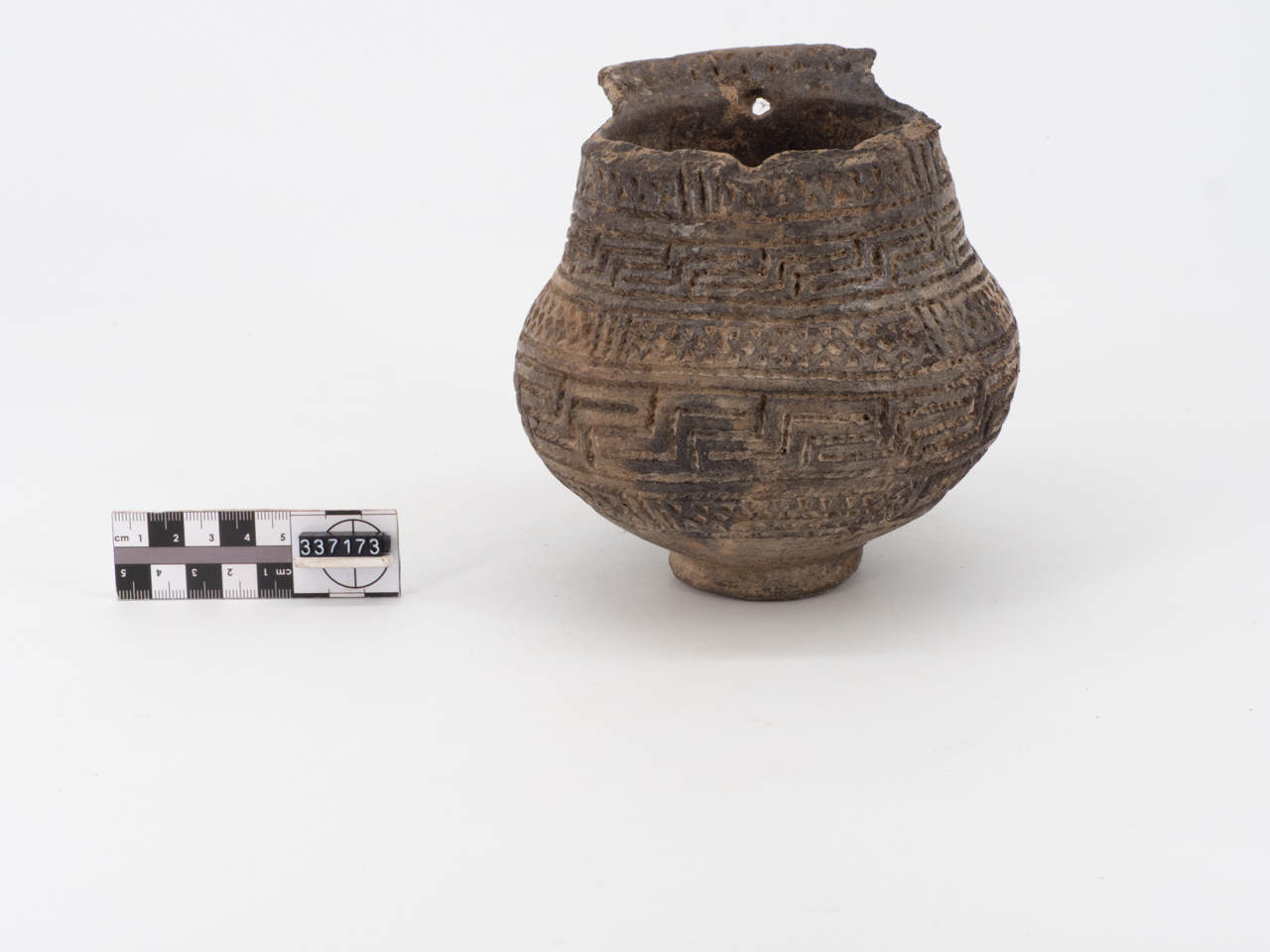 Vaso campaniforme a corpo globulare in impasto bruno pertinente alla facies appenninica; orlo estroflesso arrotondato con fori passanti al di sotto; piede ad anello; decorazione con triangoli excisi alternati sull'orlo e meandro exciso
