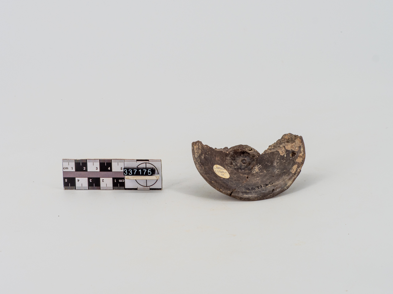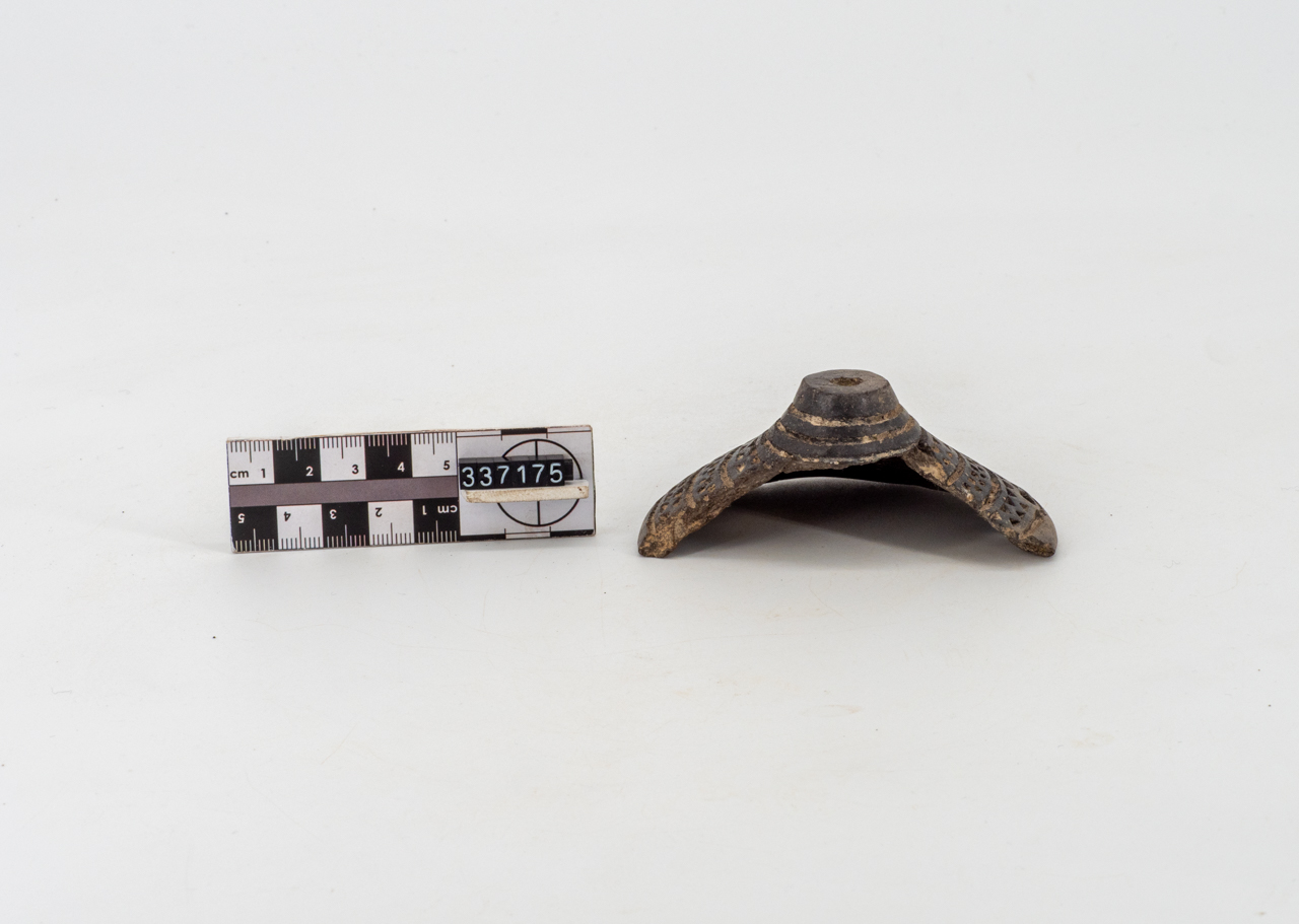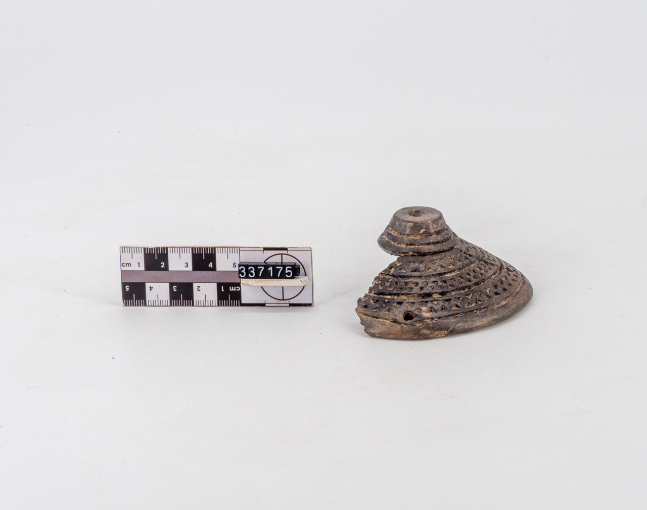 Coperchio pertinente alla facies appenninica; presa con foro passante; decorazione con triangoli excisi su file alternate; sulla parete del coperchio foro passante