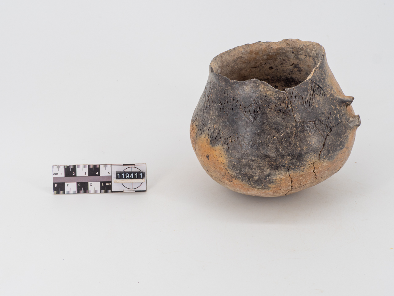 Olla in impasto beige; ansa frammentaria; fondo piano; decorazione a triangoli incisi