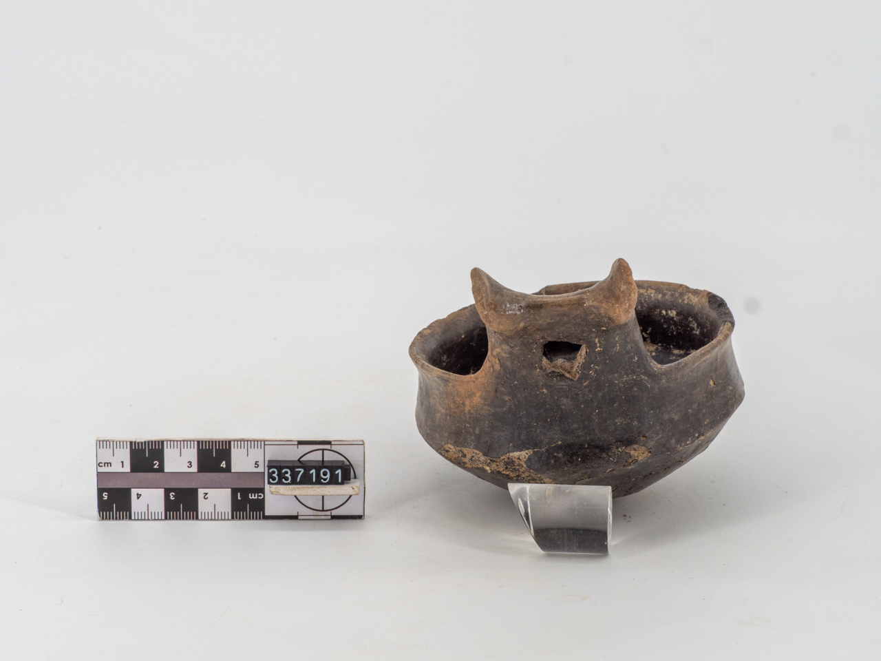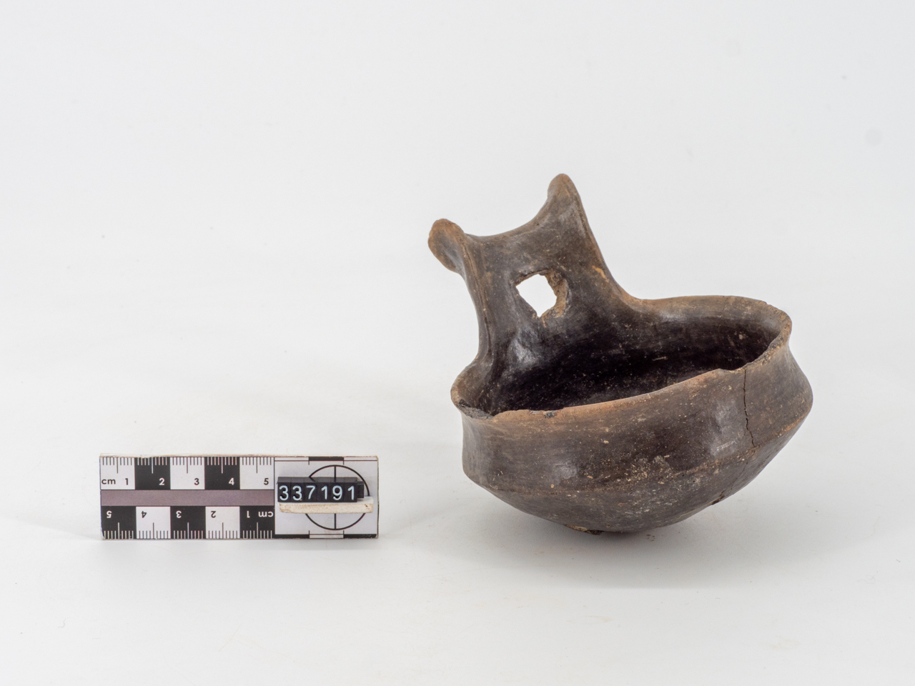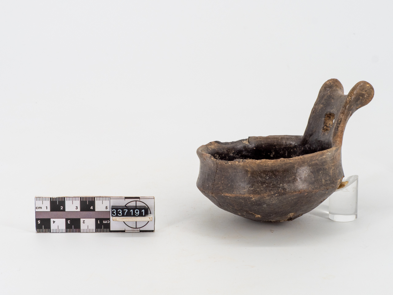 Tazza attingitoio in impasto bruno; ansa sopraelevata con terminazione cornuta; foro passante subquadrato; fondo ombelicato