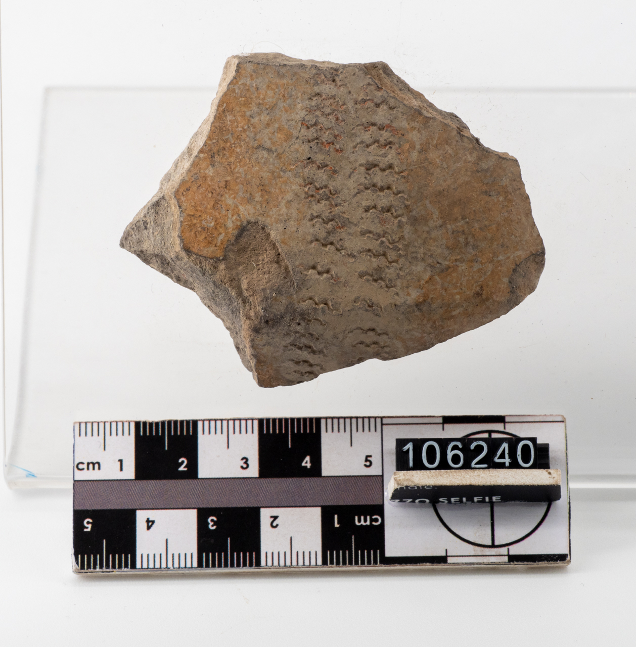 Frammento di parete di ciotola in impasto beige-arancio semidepurato; decorazione ad impressioni cardiali verticali