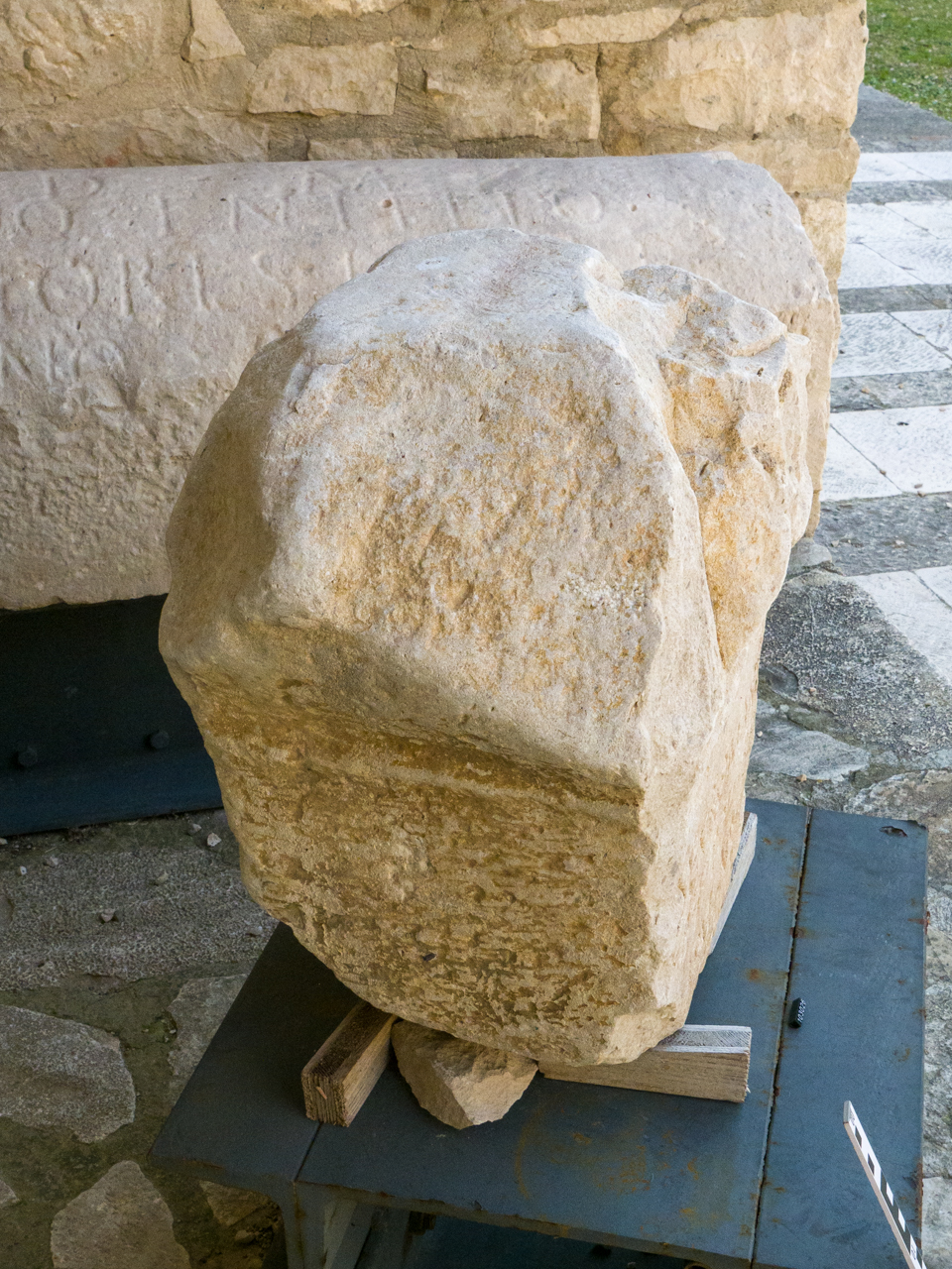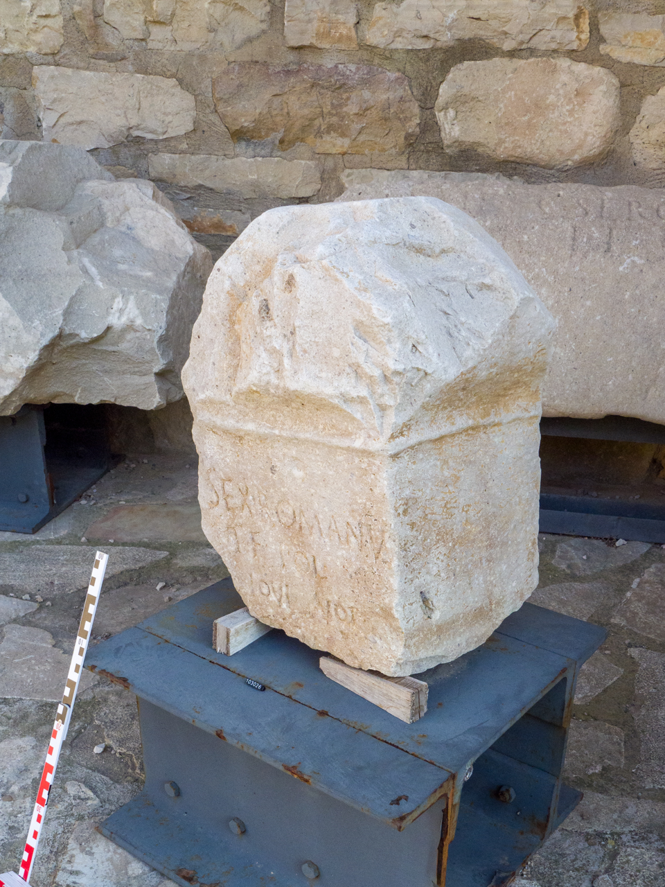 Arula di forma parallelepipeda; coronamento modanato con iscrizione votiva dai caratteri irregolari