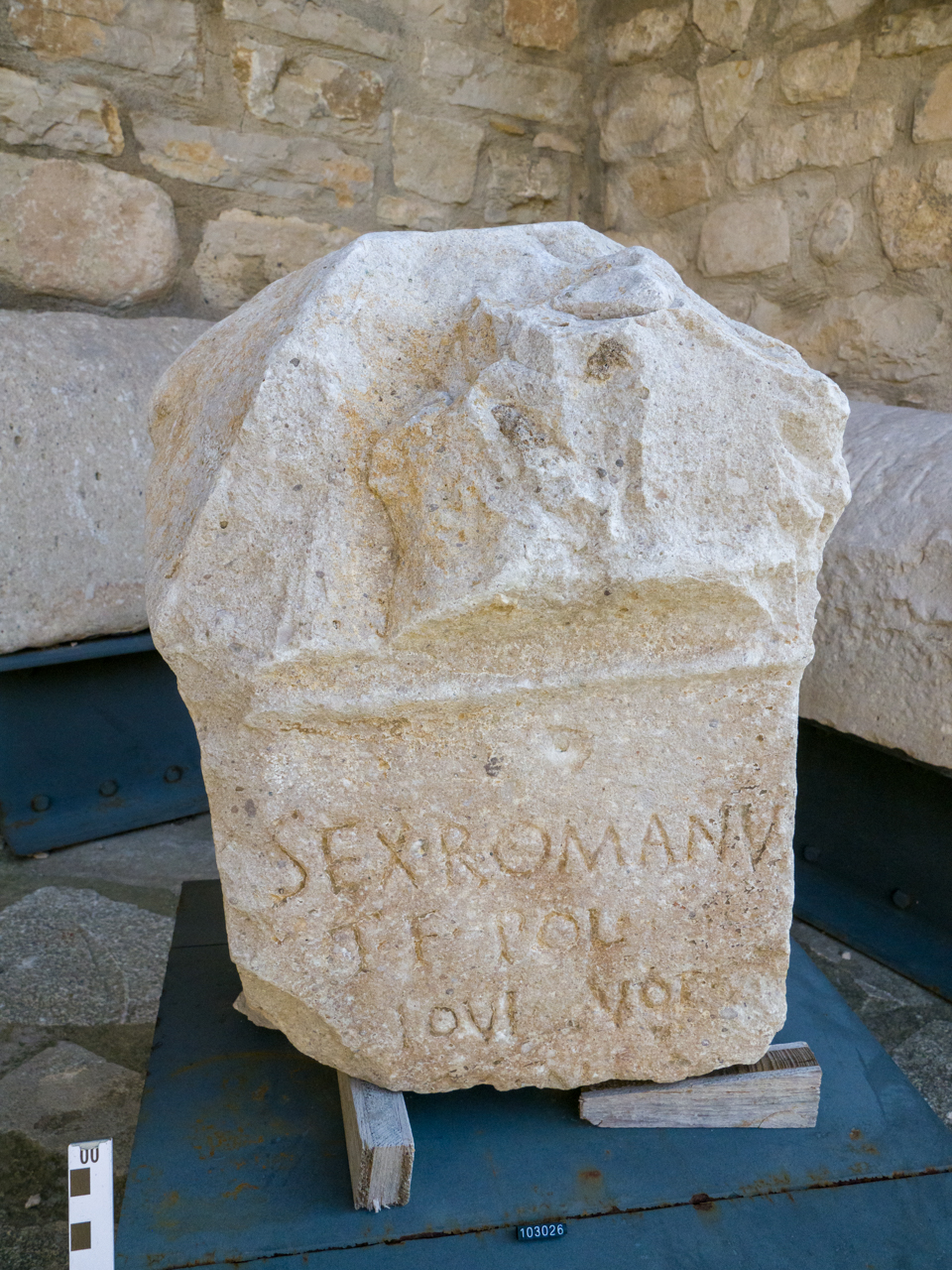 - ISCRIZIONI Sex(tus) Romanuṣ T(iti) f(ilius) Pol(lia) Iovi vo(tum) ṣ(olvit) ḷ(ibens) ṃ(erito) - maiuscolo - a incisione - latino