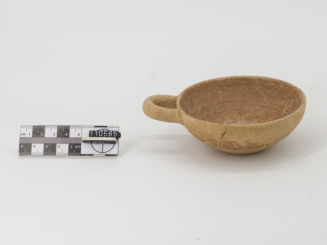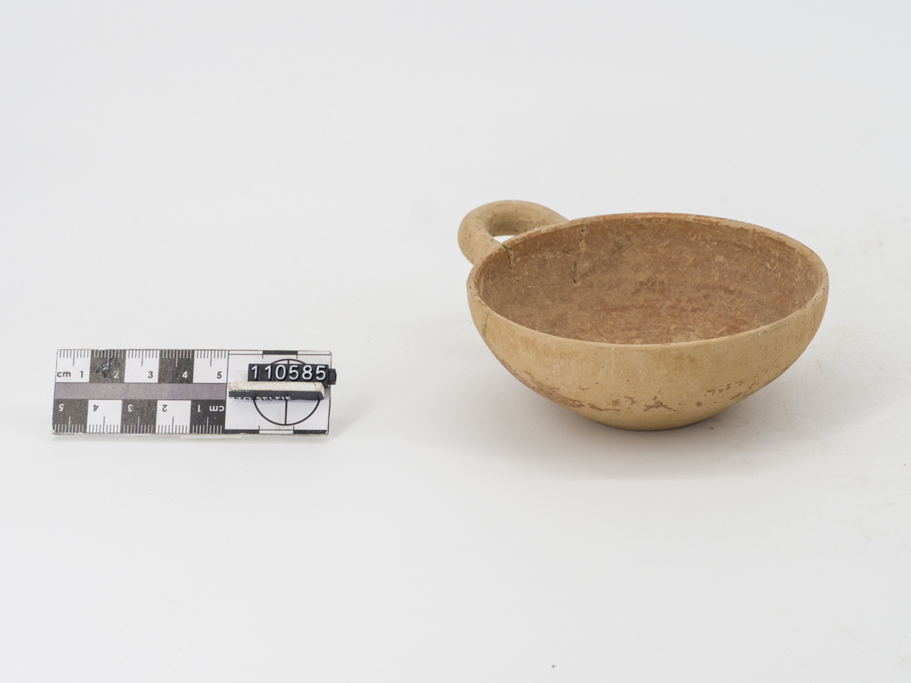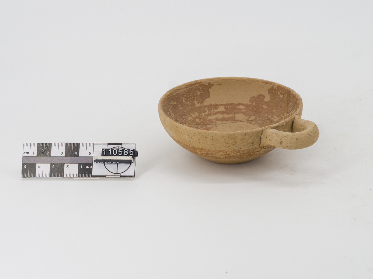 Coppetta monoansata; vasca fonda; ansa a bastoncello; fondo piano; verniciata internamente e decorata a bande sotto l'ansa