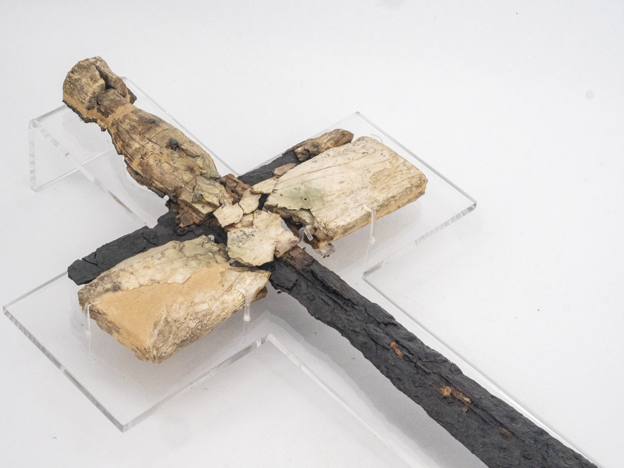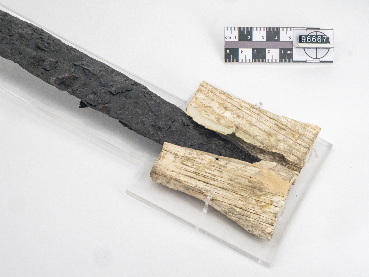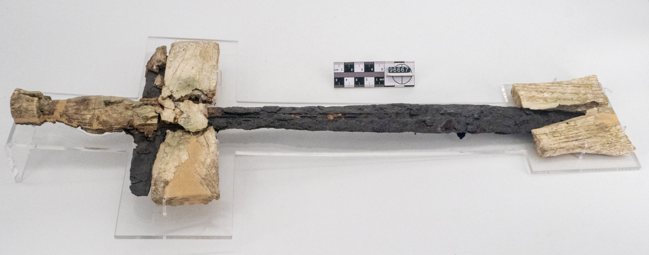 Spada a lama retta inserita nel fodero. Lama lunga e sottile, a doppio taglio, a sezione lenticolare; lingua di presa a profilo arcuato, desinente in alto in due piccoli aggetti laterali; guardamani a crociera. L'elsa e il guardamani sono entrambi rivestiti in osso, fissato con piccoli chiodi in bronzo. Del fodero si conservano: l'elemento trasversale costituito da due placche in osso collocate all'imboccatura, al di sotto del guardamano, e un analoga placca in osso, a profilo svasato, in cui sono inseriti la parte terminale e il puntale della spada. Quest'ultima era sospesa a tracolla tramite una fascia in materiale organico (cuoio), purtroppo non conservatosi, in cui erano inseriti due anellini in osso ed un vago cilindrico in pasta vitrea blu