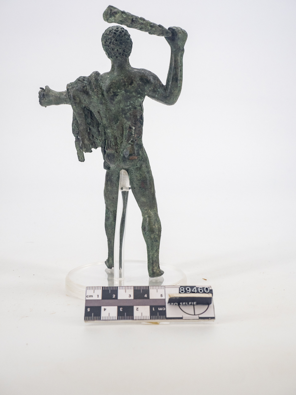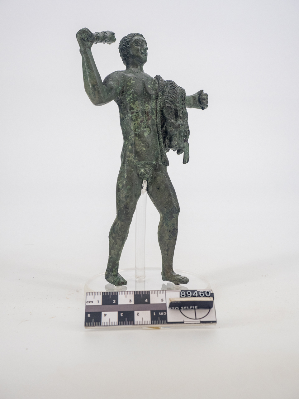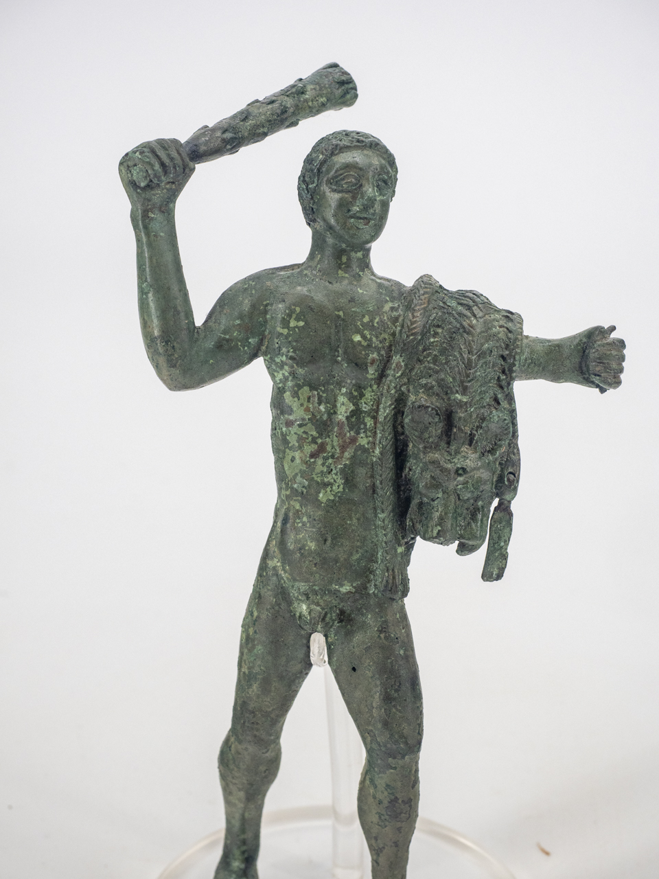 statuetta di Eracle in bronzo. L'eroe nudo è raffigurato in atto di avanzare con le gambe ben divaricate: la sinistra poggia saldamente a terra, a destra, arretrata, presenta il tallone appena sollevato. Secondo un comune schema chiastico, la mano corrispondente, portata all'altezza del capo, brandisce la clava; la sinistra, protesa in avanti, esibisce invece un attributo molto più sottile, di cui sopravvive solo un tratto brevissimo stretto nel pugno; con ogni probabilità si tratta dell'arco. Sulla medesima spalla è gettata la grande leontè. Il corpo dalle fattezze robuste appare nel complesso piuttosto allungato. La statuetta appare realizzata secondo la tecnica più semplice in un unico blocco a fusione piena, con la sola eccezione dei due attributi, eseguiti a parte e quindi inseriti nelle mani. Evidenti i molti ritocchi a freddo eseguiti con grande cura