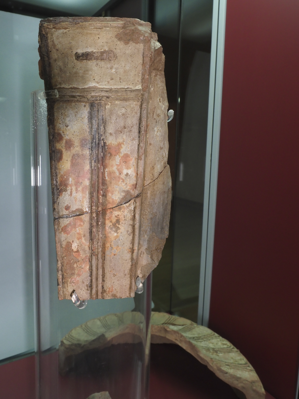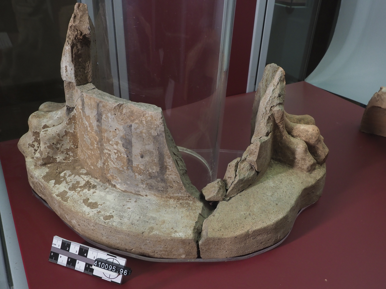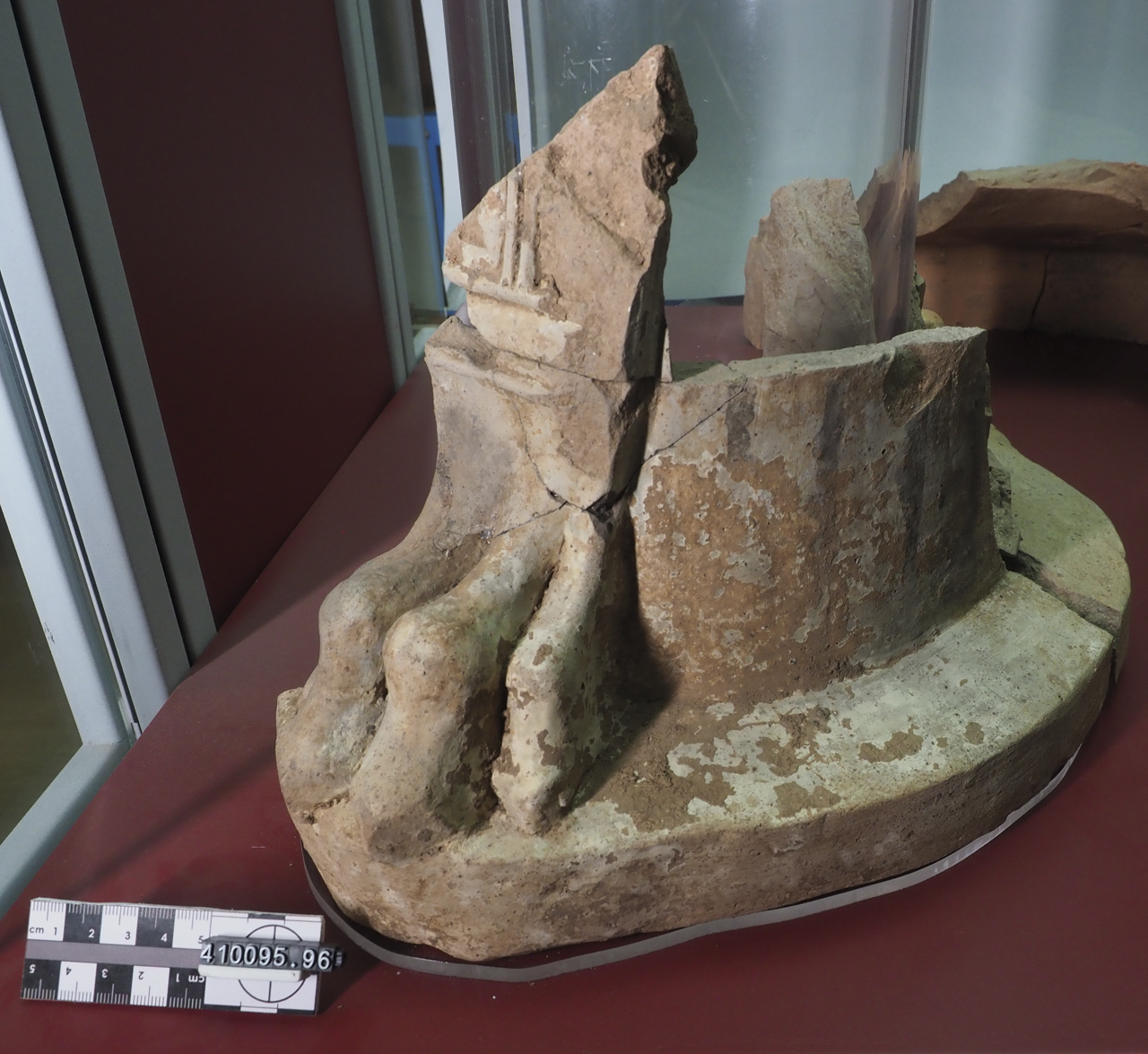 Frammenti riferibili ad un tripode in terracotta decorata, di cui restano le zampe leonine della base e le pareti del sostegno con le costolature verticali a rilievo. La base ha un profilo sinusoide. Le singole parti recuperate indiziano l’appartenenza a più gruppi plastici, caratterizzati da una evidente asimmetria che lascia sospettare una reale incompletezza del o dei sostegni, spiegabile, forse, con una funzione di rivestimento