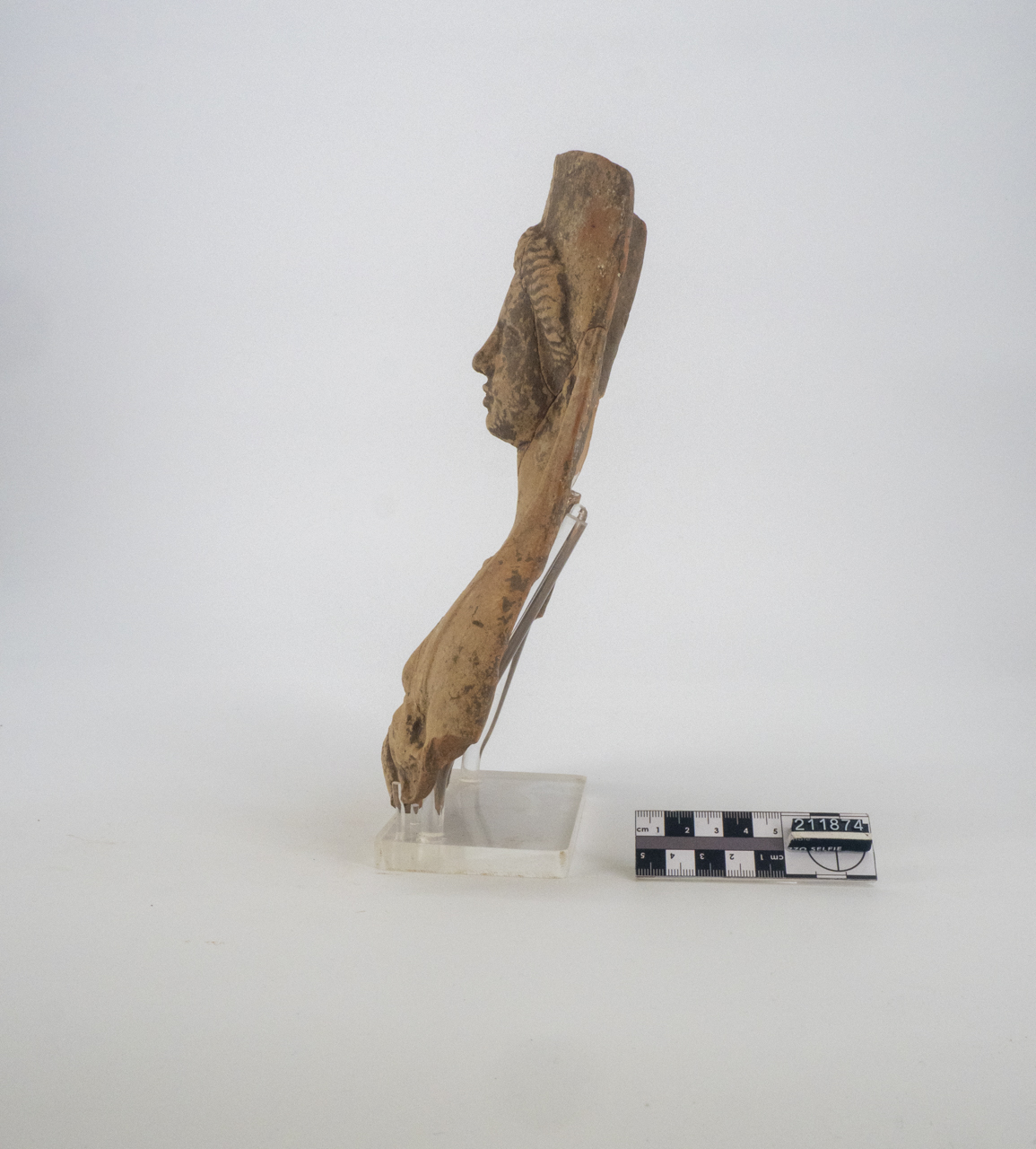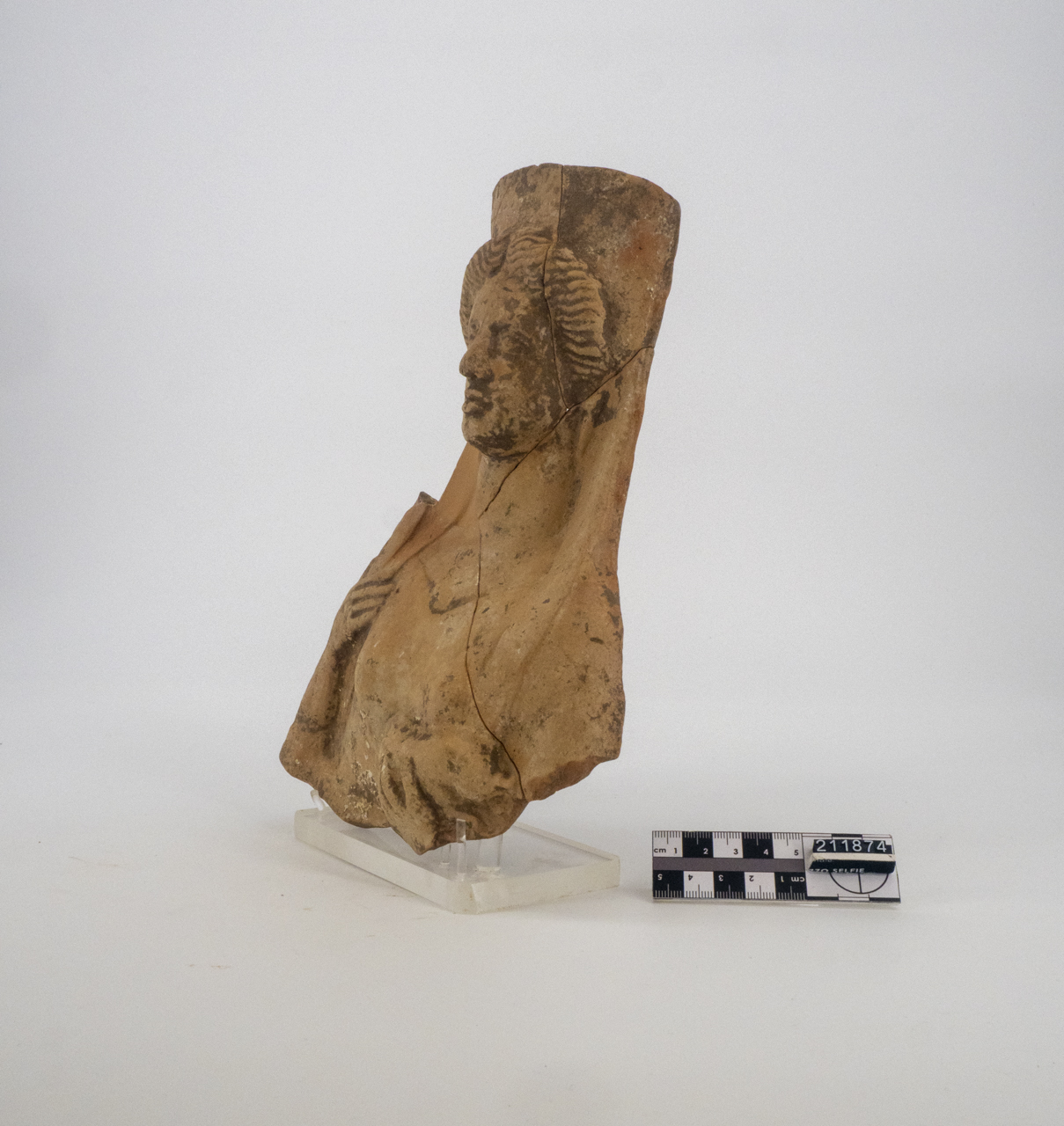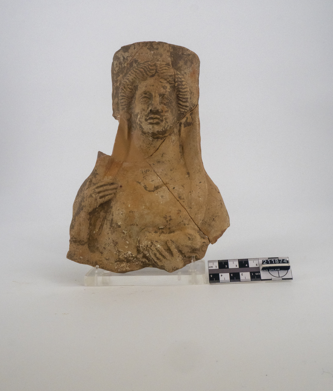 Busto rappresentante Demetra con i capelli mossi e raccolti; lineamenti del viso delicati; labbra dischiuse e pronunciate; indossa degli orecchi tondi con pendenti; con la mano sinistra regge un porcellino, mentre la destra è alzata a mantenere un oggetto non identificabile