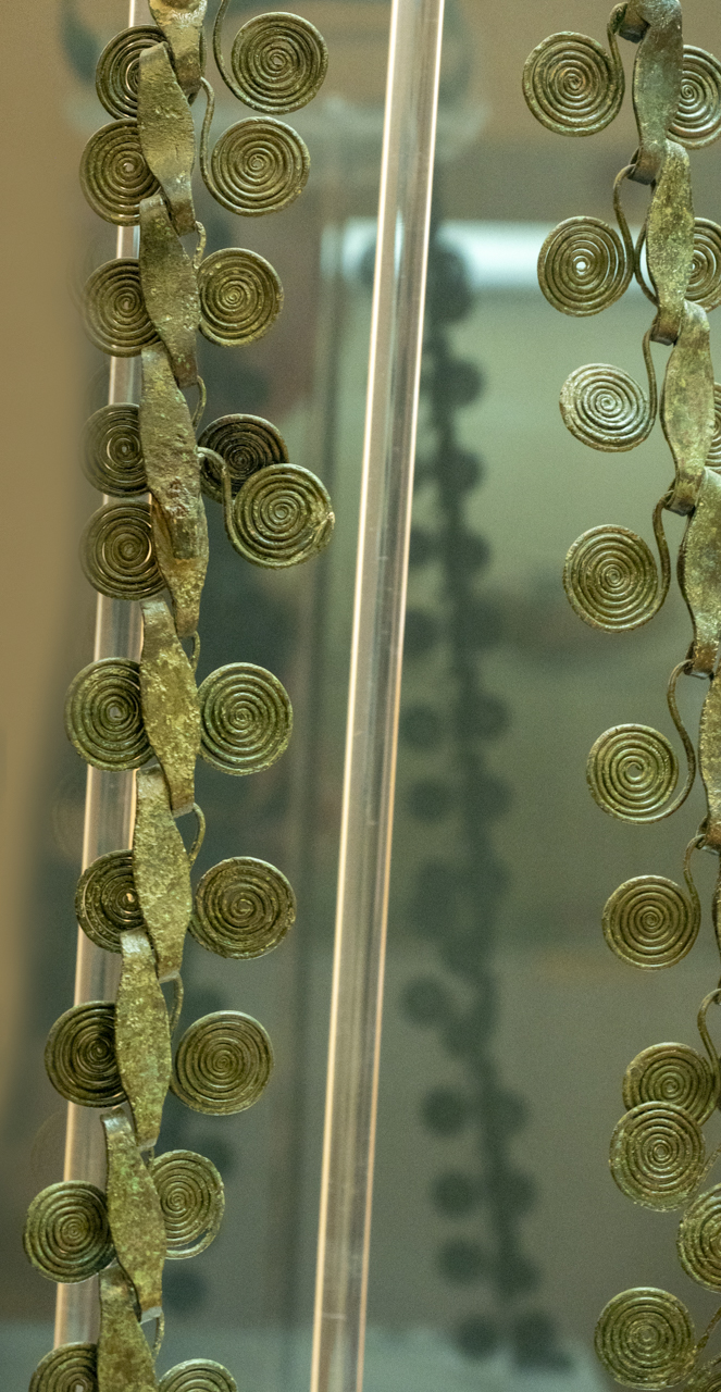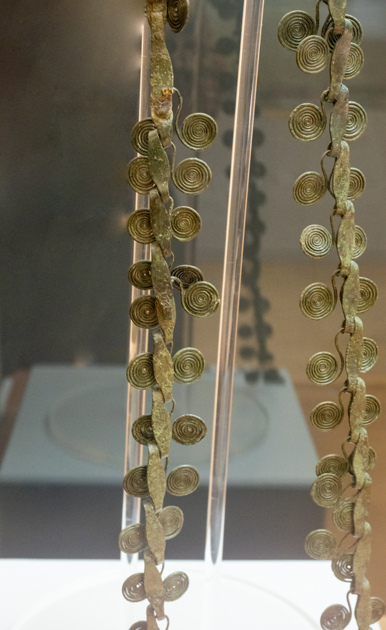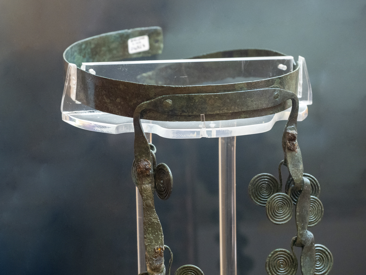 Diadema in lamina di bronzo con i due lunghi pendenti laterali ornati da elementi a doppia spirale di indubbia tipologia balcanica