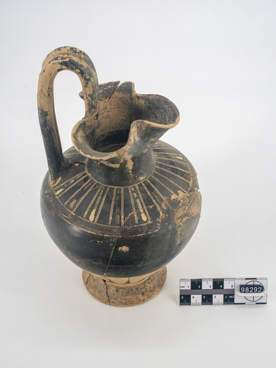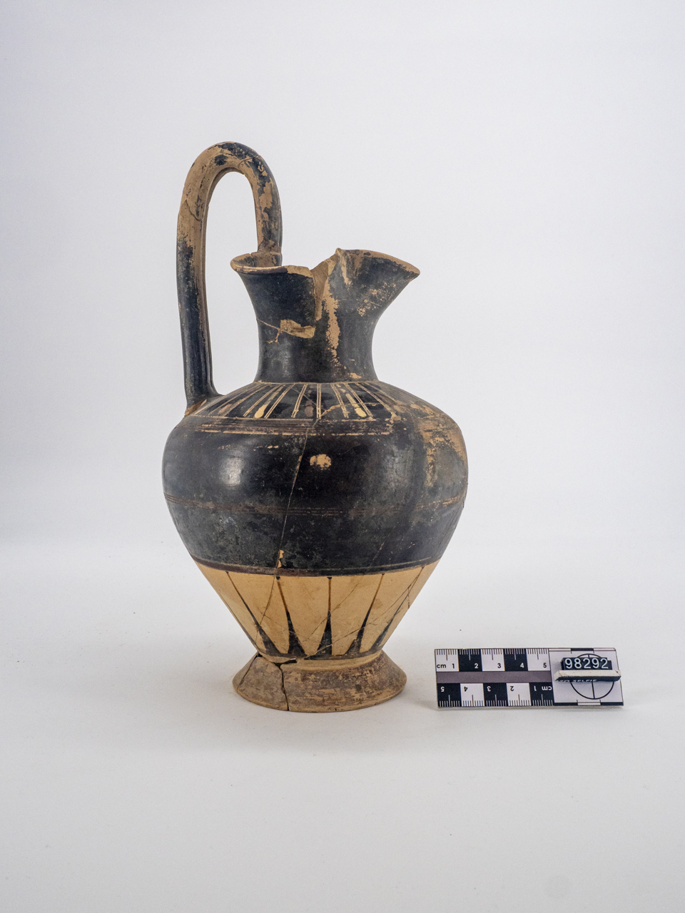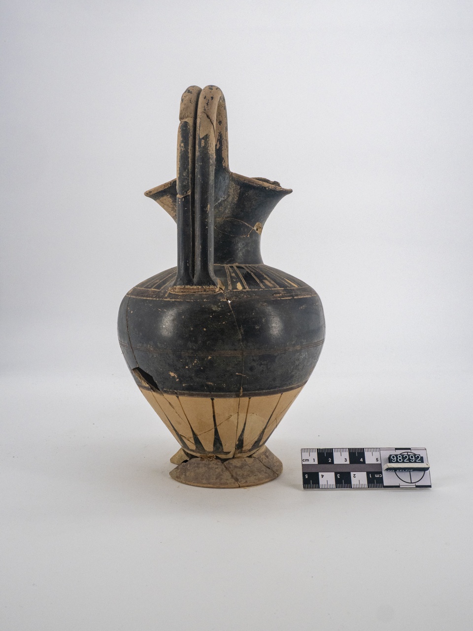 Labbro trilobato; collo cilindrico; corpo ovoidale; piede troncoconico. Ansa a nastro con costolatura