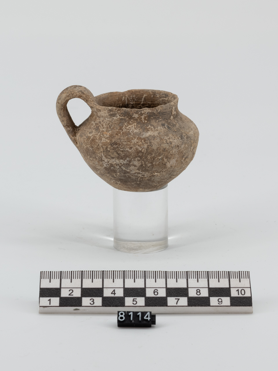 apoda, corpo globulare depresso, labbro obliquo, ansa verticale sormontante a nastro ispessito; tracce di vernice bruna