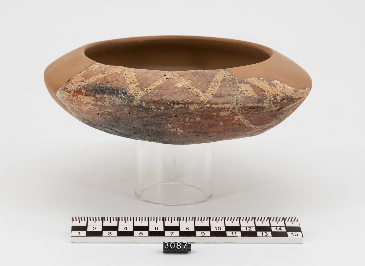 ciotola carenata decorata con motivi graffiti, bande tratteggiate a scaletta formanti ampi zig zag