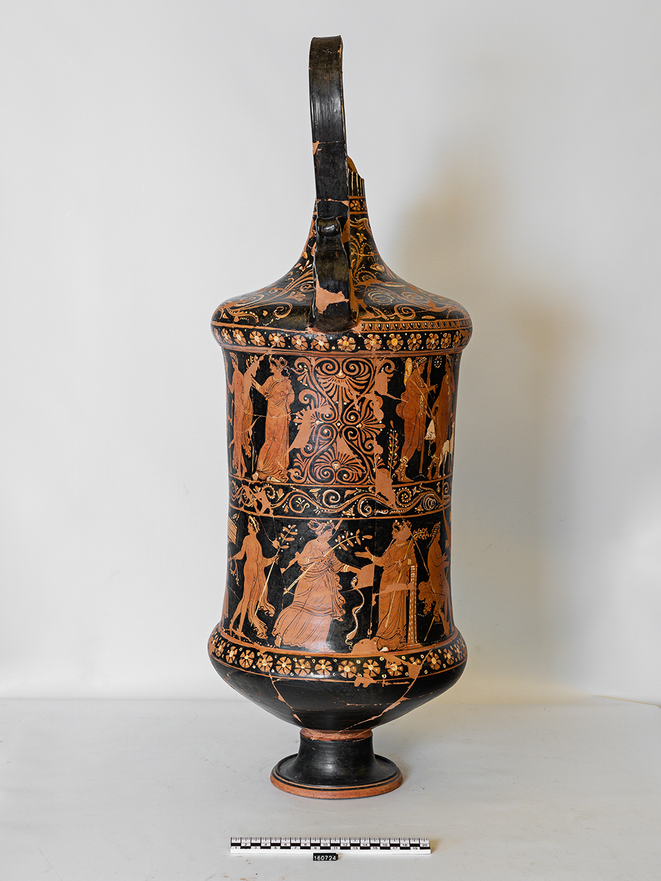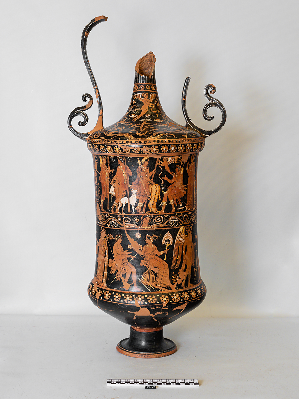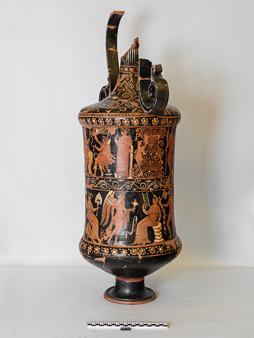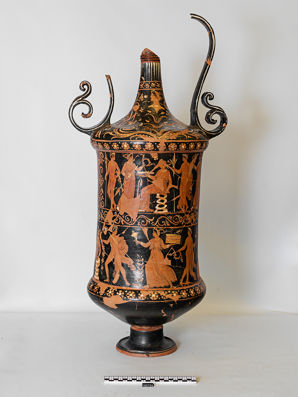 Piede campanulato cavo, base a profilo ovoide, fondo pervio chiuso da un tapo mobile costituito da un piede di vasetto; corpo cilindrico con rigonfiamenti alle estremità; spalla fortemente rientarnte e collo a profilo concavo interrotto da un doppio cordone rilevato. Anse a nastro a sezione rettangolare con volute bifide all'attacco inferiore, con riccioli rastremati nelle parte finale. Vernice nera lucente, sovraddipinture in colore bianco e giallo di varie tonalità fno al marrone