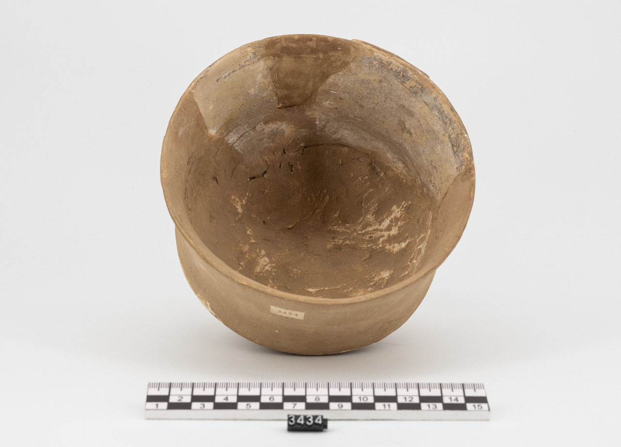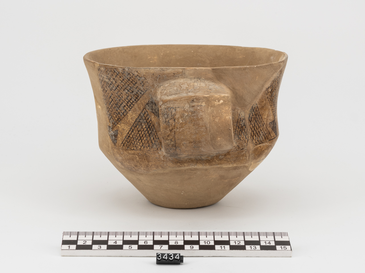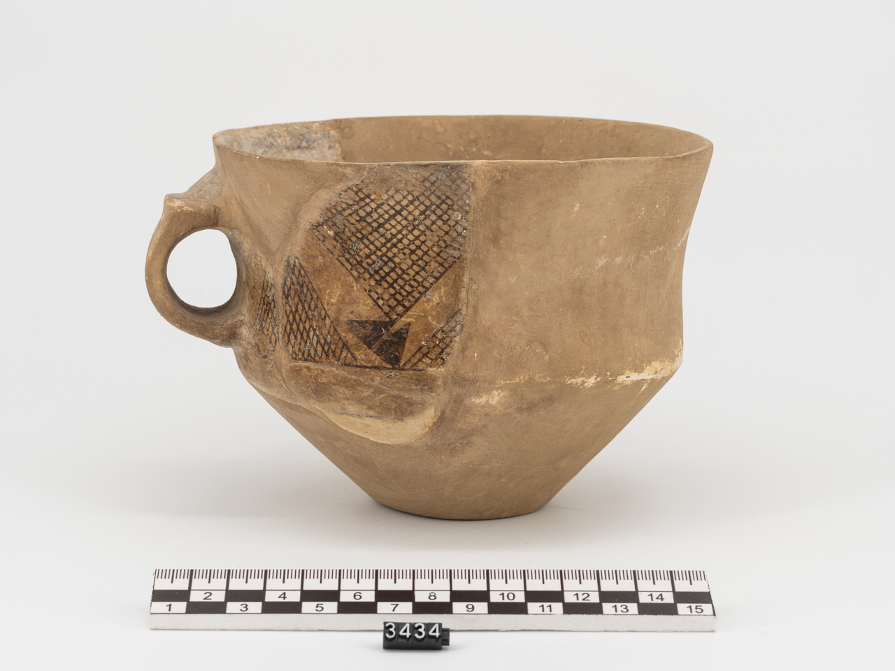 Tazza monoansata in argilla figulina levigata e lucidata, di colore giallo-bruno, con carena bassa, parete verticale, listello orizzontale a pizzico sopra l'ansa
