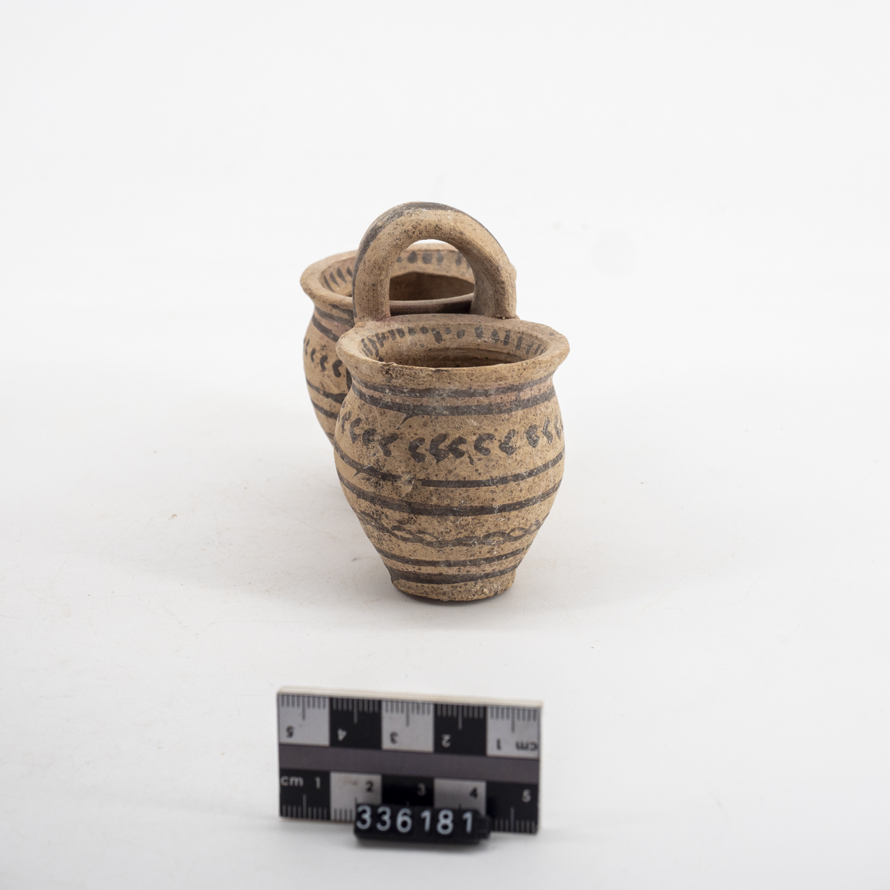 Situla gemina in ceramica listata. Orlo leggermente estroflesso e superiormente appiattito. Corpo ovoidale e piede piano. Ansa sormontante a nastro, impostata sulla pancia dei due contenitori