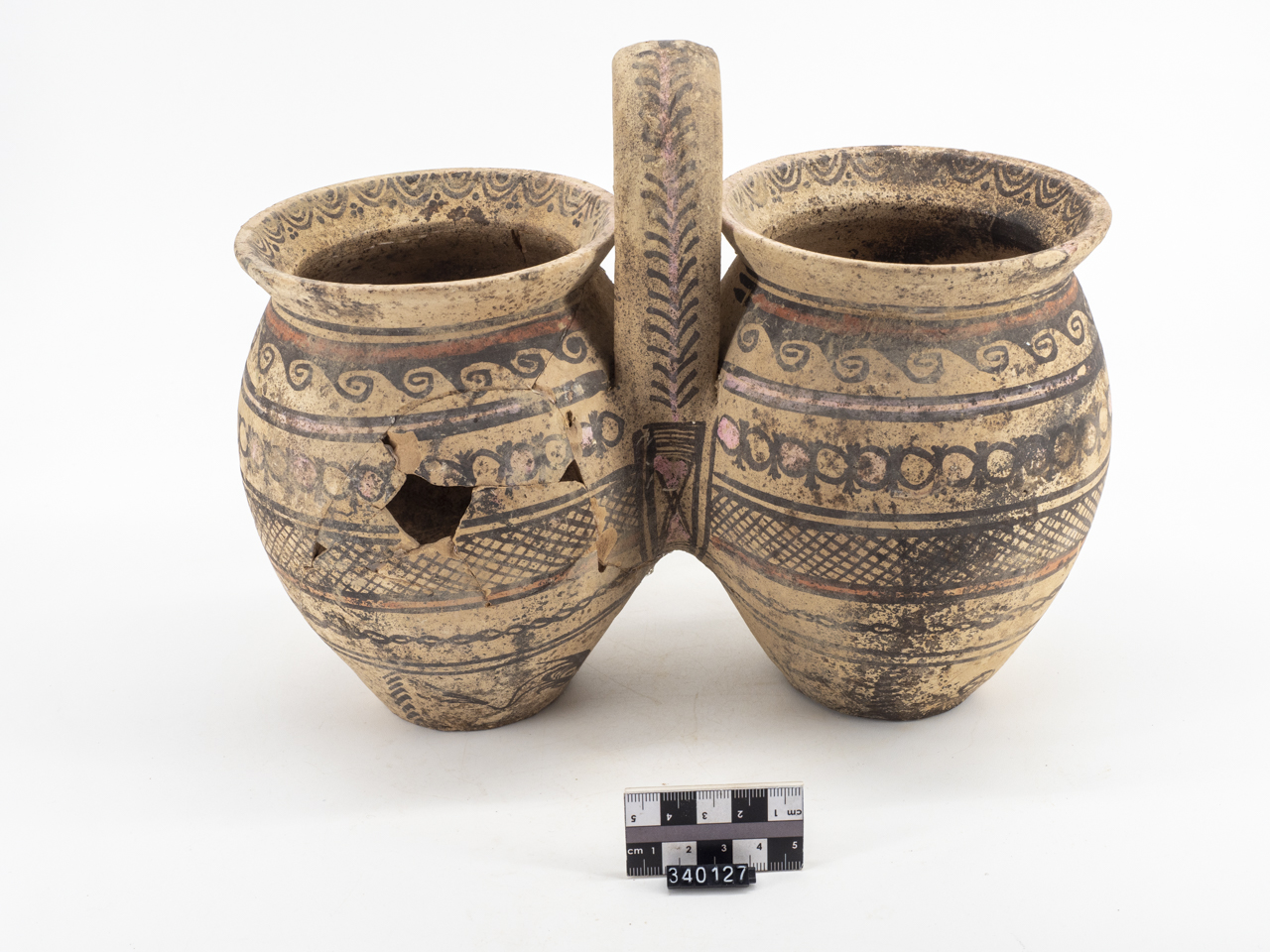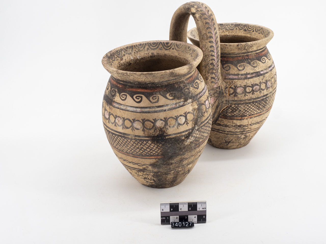 Doppia situla in ceramica sovradipinta, frammentario, ricomposto e lacunoso. Orlo superiormente appiattito e leggermente estroflesso. Corpo globulare e piede piano. Ansa a nastro sormontante, impostata sulla spalla dei due vasi