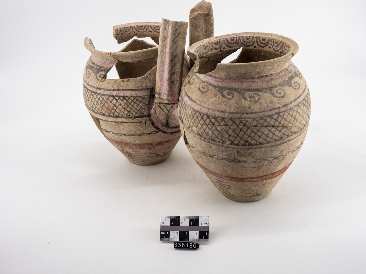Boccale gemino in ceramica sovradipinta, frammentario, ricomposto e lacunoso. Orlo superiormente appiattito e leggermente estroflesso. Corpo globulare e piede piano. Ansa a nastro sormontante, impostata sulla panciadei due vasi