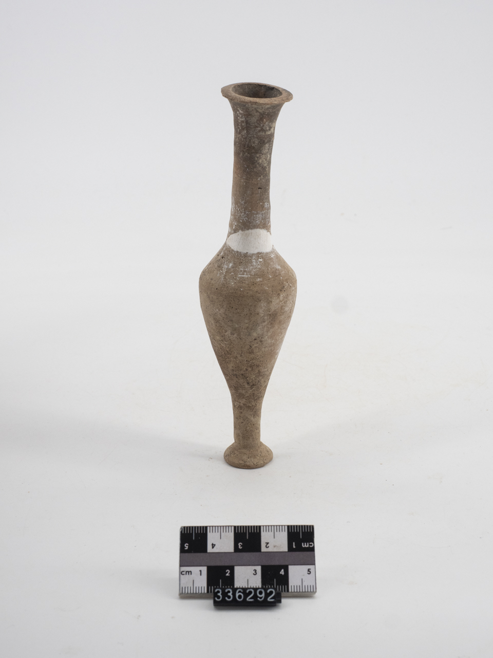 Unguentario restaurato e integrato alla base del collo. Orlo estroflesso e superiormente appiattito. Lungo collo cilindrico. Corpo ovoidale allungato. Piede piano sagomato