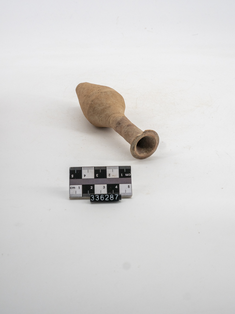 Unguentario mancante del fondo. Orlo estroflesso e superiormente appiattito. Lungo collo cilindrico. Corpo ovoidale allungato. spalla distinta dal corpo. Piede piano sagomato