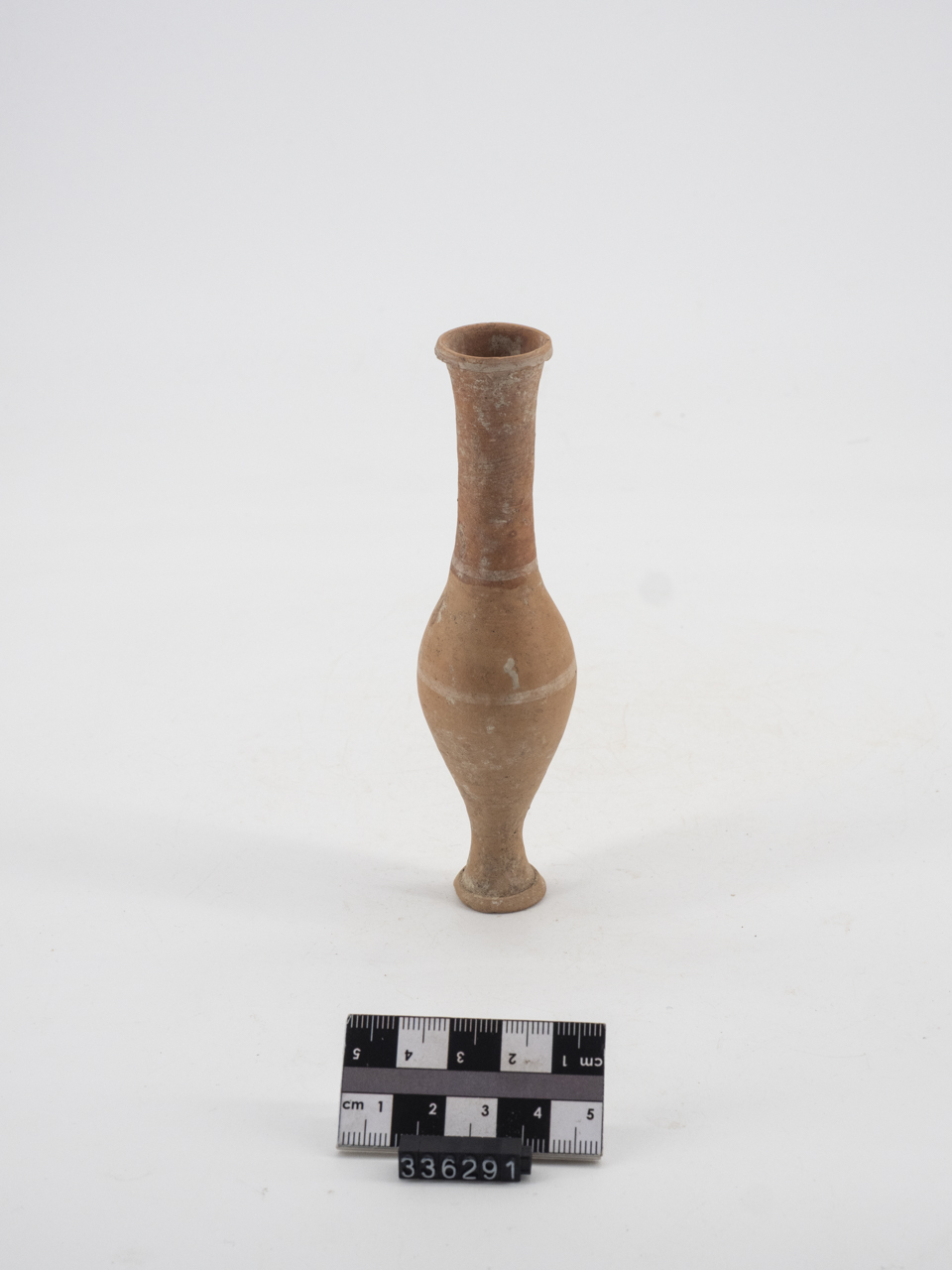 Unguentario integro. Orlo a colletto distinto dal lungo collo cilindrico. Corpo ovoidale allungato. Piede piano sagomato