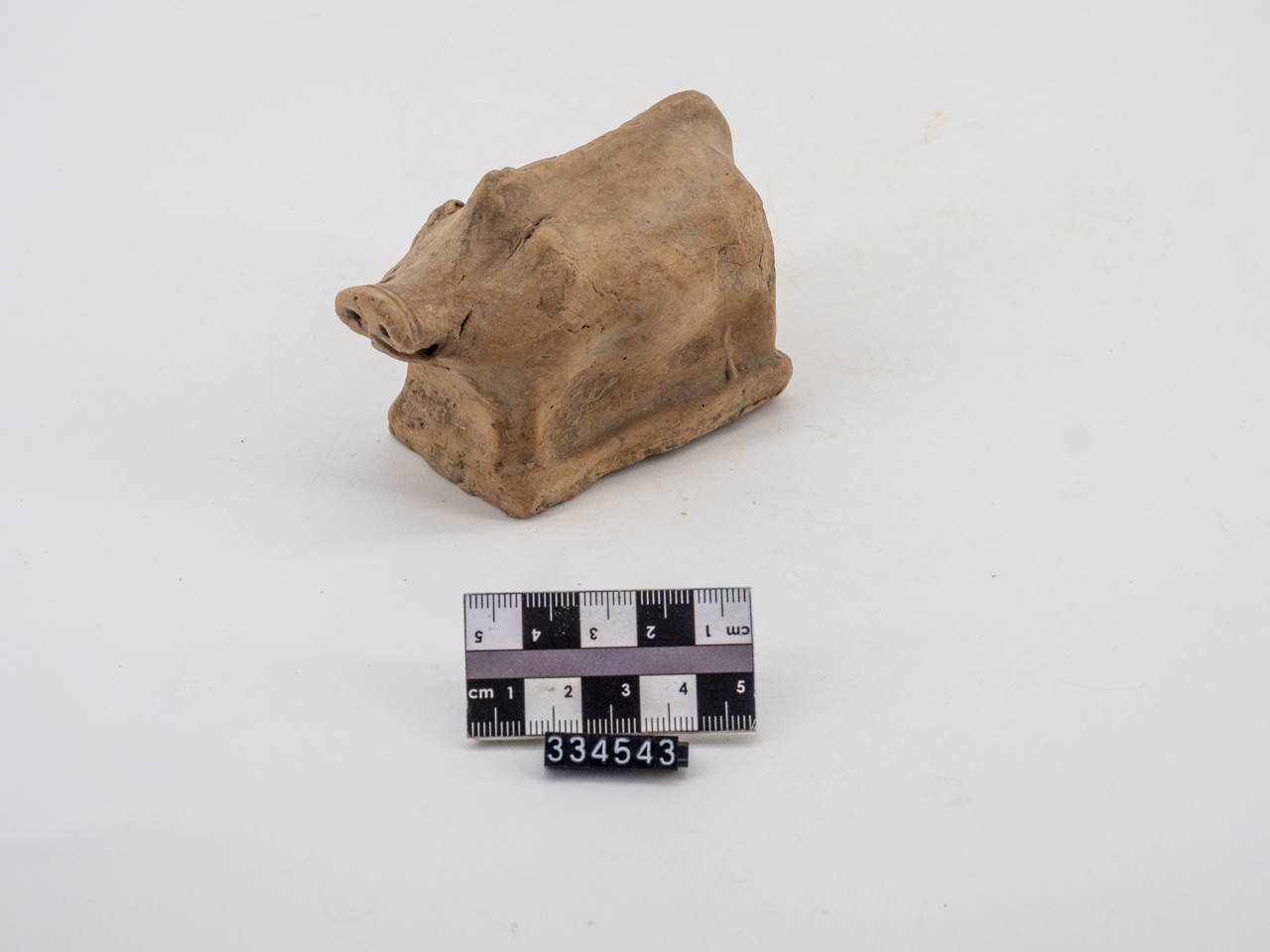 Statuetta a forma di porcellino. Visibili le orecchie e il muso caratterizzato da una doppia incisione parallela e due forellini come narici. visibile anche il dorso dell'animale e la coda rilevati. Base piana e sagomata