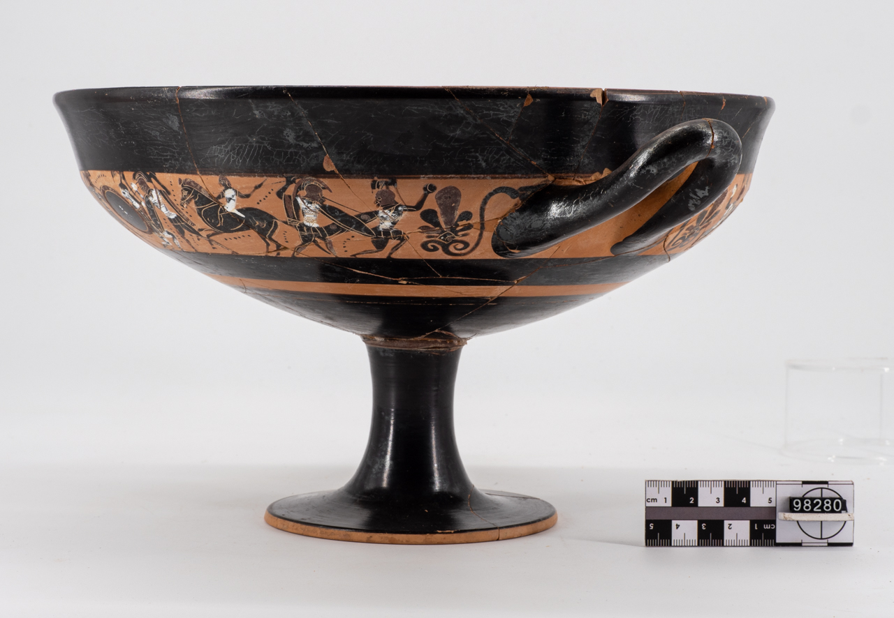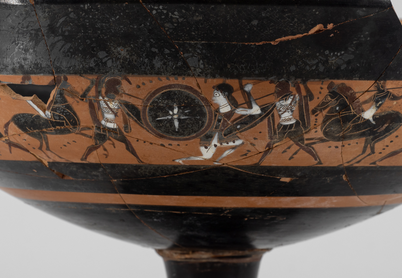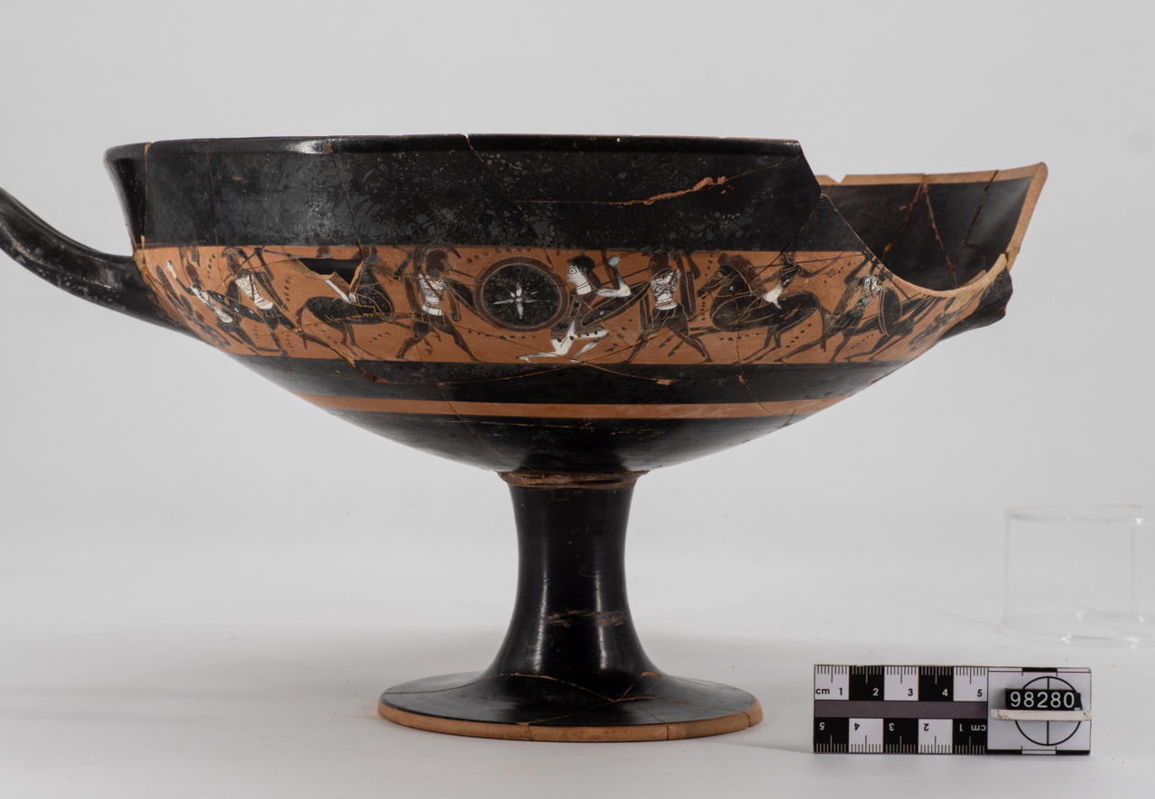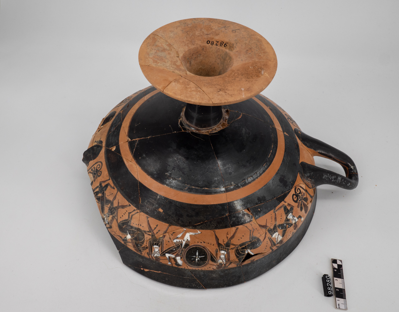 Labbro concavo con orlo estroflesso e arrotondato, vasca emisferica, alto piede piatto a profilo concavo con anello plastico a separarlo dalla vasca, anse a bastoncello oblique e disposte sulla fascia decorata. Argilla rosata, vernice evanide. Incisi i dettagli degli opliti, dei cavalieri, dei cavalli e degli indumenti dell'Amazzone. Sovraddipinti in rosso-violaceo: gli elmi, gli schinieri, il bordo degli scudi, le clamidi e il chitonisco dell'Amazzone. Sovraddipinti in bianco: la pelle dell'Amazzone, i chitonischi dei cavalieri e dell'Amazzone e gli episemata