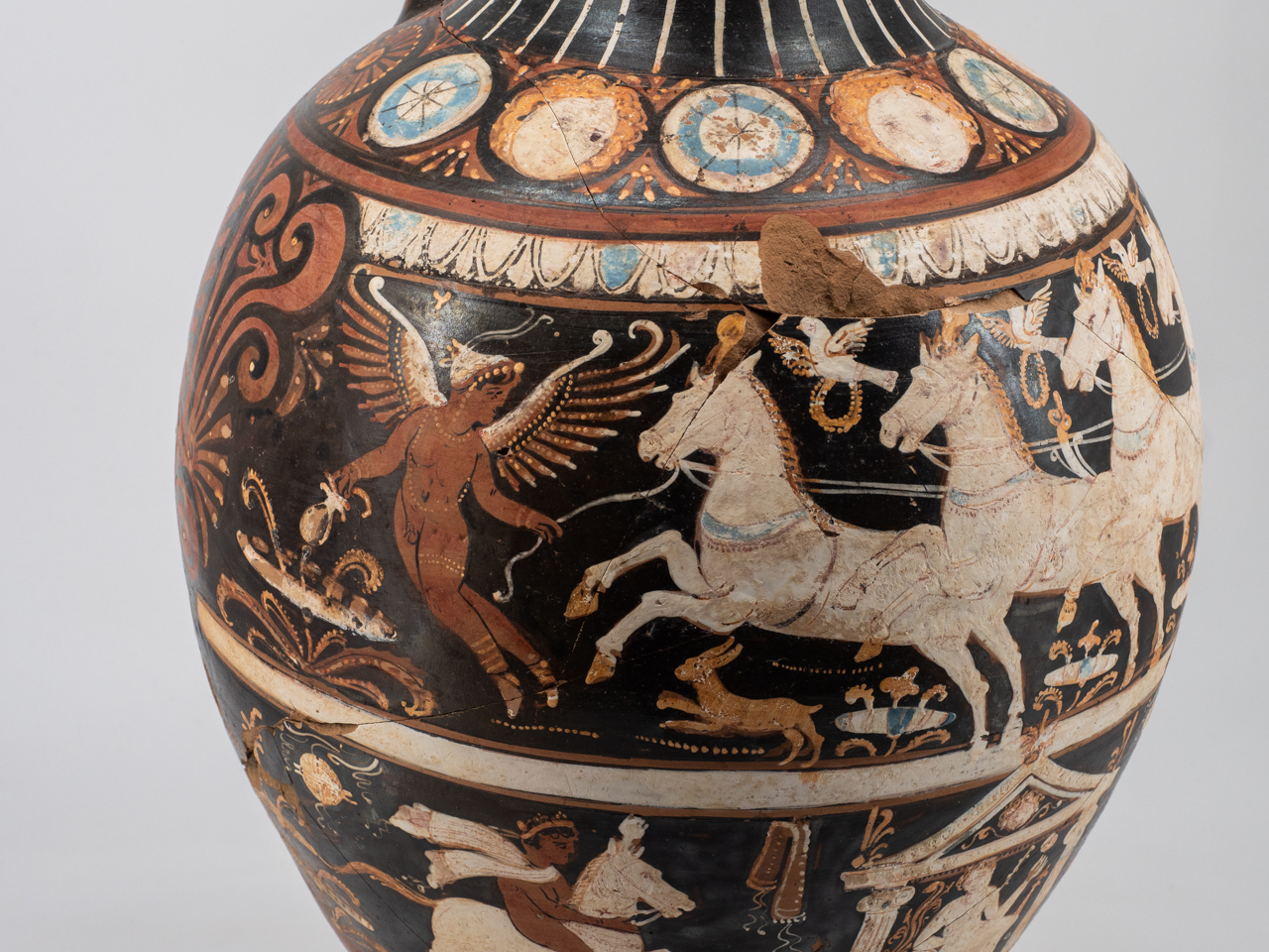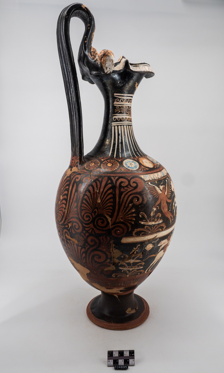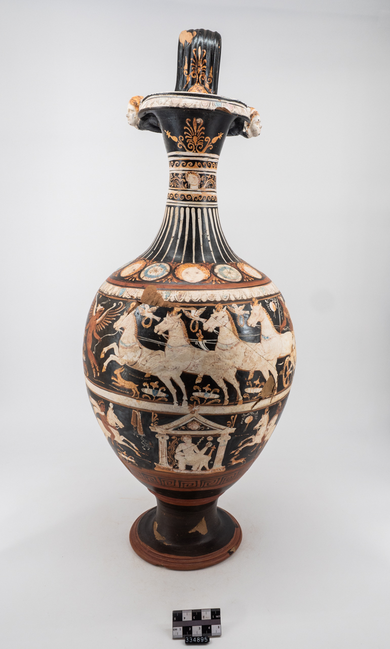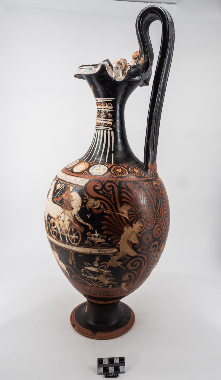 - NOTIZIE STORICO CRITICHE Questo vaso è pertinente a un nucleo di 17 pezzi (334887-334888, 334891-334898, 334923-334927, 334712-334713) commissionati precipuamente per la deposizione, quindi di un livello produttivo più accurato. Questo nucleo differisce dagli altri manufatti che paiono stock d'officina forse già in possesso dei familiari del deposto (Bottini et alii, pp. 41-42). La decorazione è attribuita al Pittore del Sakkos bianco, al quale pertiene l'attribuzione specifica proprio di uno dei vasi di questo nucleo di Melfi