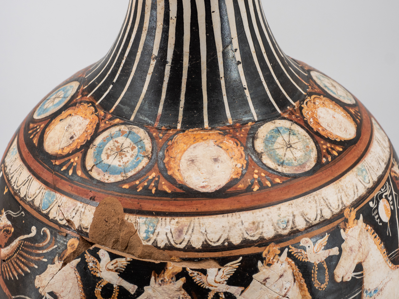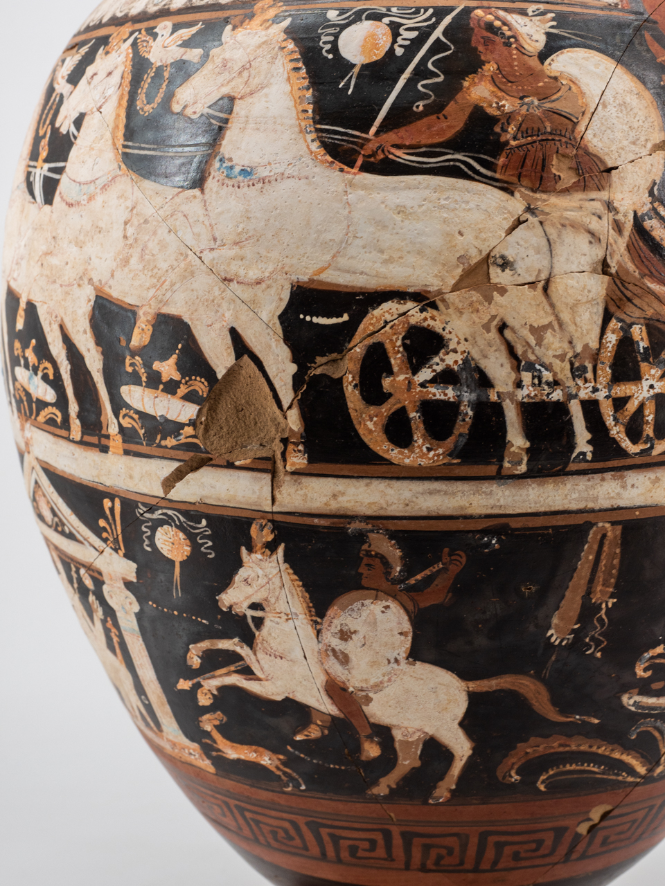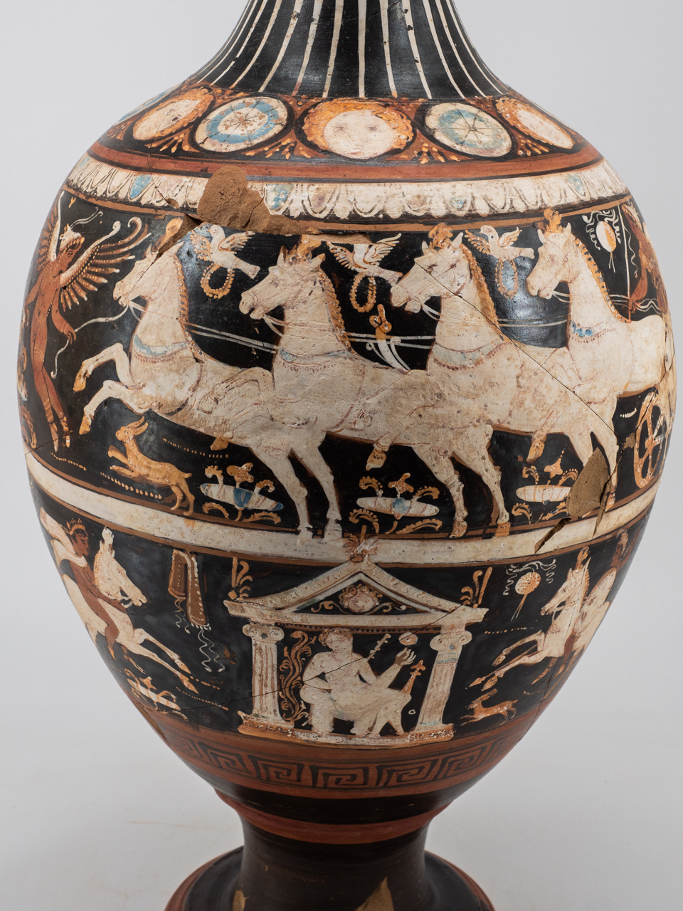 - NOTIZIE STORICO CRITICHE Questo vaso è pertinente a un nucleo di 17 pezzi (334887-334888, 334891-334898, 334923-334927, 334712-334713) commissionati precipuamente per la deposizione, quindi di un livello produttivo più accurato. Questo nucleo differisce dagli altri manufatti che paiono stock d'officina forse già in possesso dei familiari del deposto (Bottini et alii, pp. 41-42). La decorazione è attribuita al Pittore del Sakkos bianco, al quale pertiene l'attribuzione specifica proprio di uno dei vasi di questo nucleo di Melfi