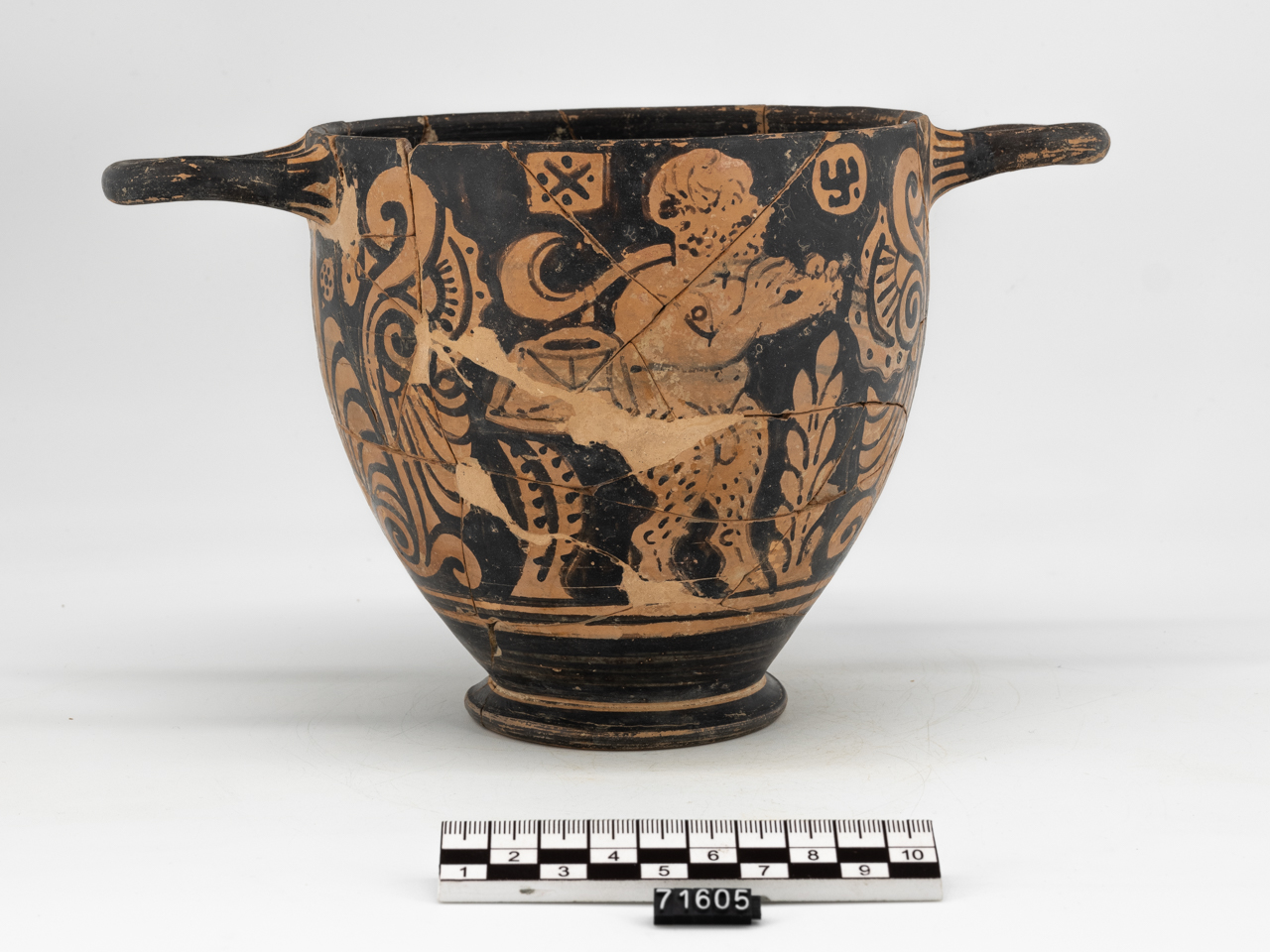Skyphos a figure rosse. Orlo indistinto, corpo piriforme, piede a disco. Anse a bastoncello orizzontali. Decorazione figurata e motivi vegetali sul corpo