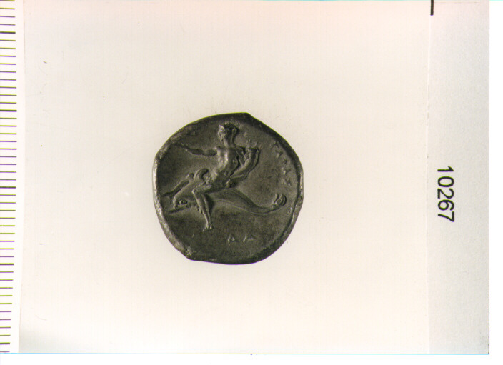 D/ CAVALIERE AL GALOPPO A D., IN ATTO DI COLPIRE CON LA LANCIA NELLA D., HA SCUDO E DUE GIAVELLOTTI NELLA S.; SOTTO E A S., LEGENDA; R/ TARAS SU DELFINO A S., HA FRECCIA NELLA D. TESA E CORNUCOPIA NELLA S.; A D. E SOTTO, LEGENDA