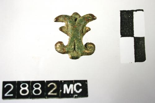 Palmetta miniaturistica stilizzata, con foglie girate a volute, trace del perno di fissaggio sul retro, superficie liscia