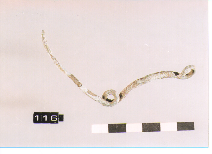 ARCO INSELLATO, AVVOLGIMENTI DISUGUALI, AGO RICURVO, MUTILO, DEFORMATO, STAFFA MANCANTE, ARCO IN FILO A SEZIONE CIRCOLARE, INGROSSATO NELL'INSELLATURA, SUPERFICIE SCABRA