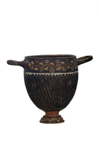 Skyphos di produzione italiota con corpo strigilato e orlo decorato con fascia vegetale sovradipinta in bianco ocra e bruno