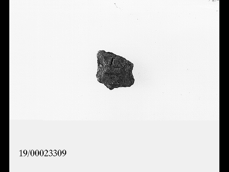 Parete esterna decorata da unghiature apparentemente isolate. Superficie color grigio scuro, opaca, relativamente lisciata. Impasto non tornito