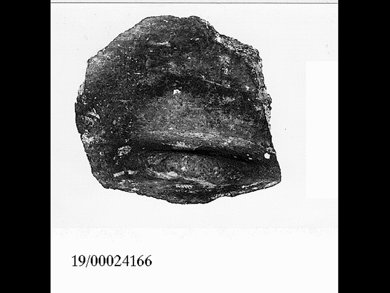 Presa a linguetta orizzontale forata, pertinente a pentola. Superficie maculata di chiazze nerastre
