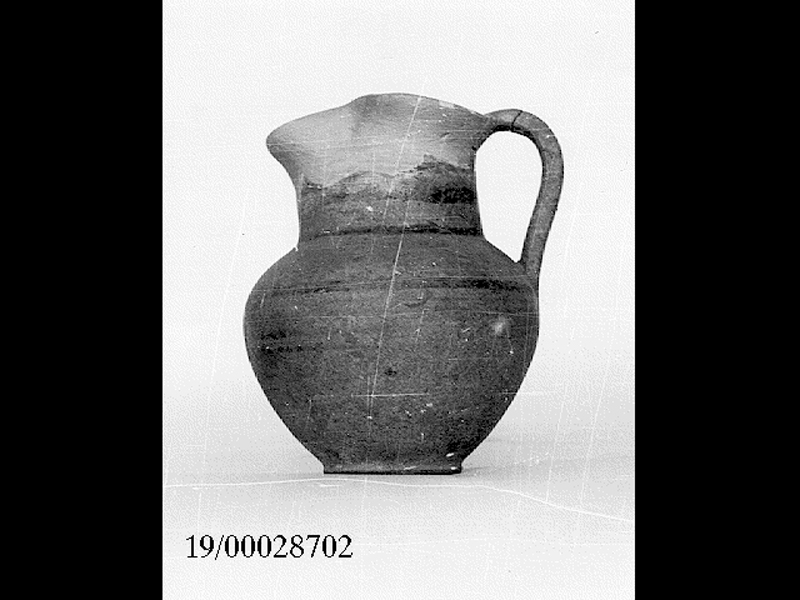 Collo cilindrico, spalla arrotondata e nettamente separata dal corpo, corpo ovoide, piede ad anello, ansa a nastro. Decorata sul collo con due fasce di vernice bruna, sulla spalla con triglifi e metope, inferiormente fasce di vernice