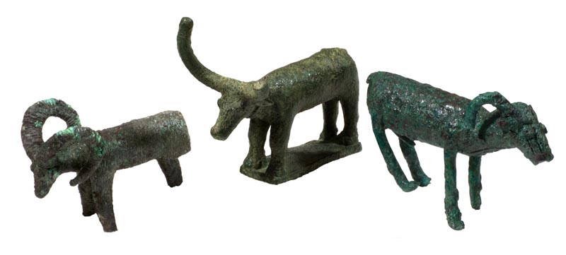 Muflone stante. Corpo cilindrico, con collo rettilineo e muso triangolare allungato verso il basso, grandi corna ritorte. Le zampe sono ben articolate e distinte, tutte frammentate