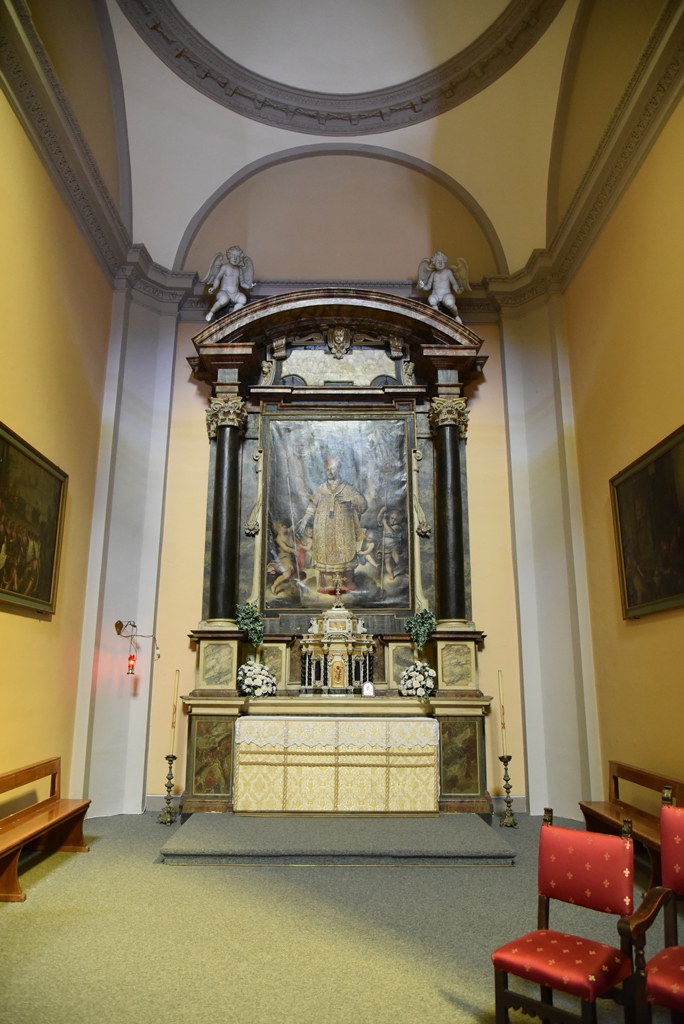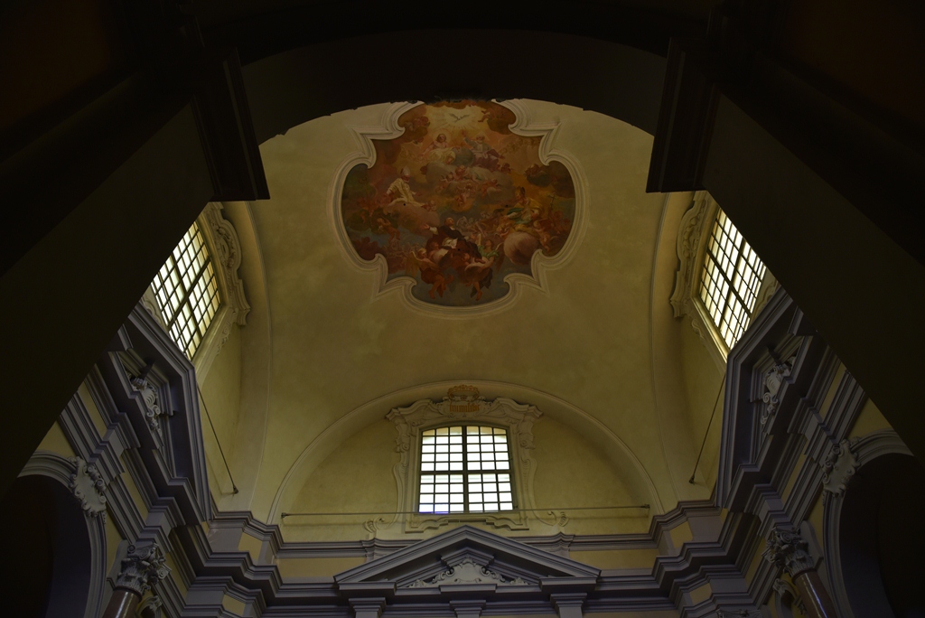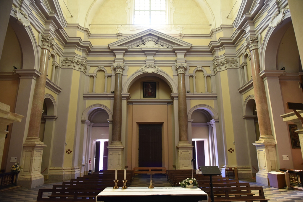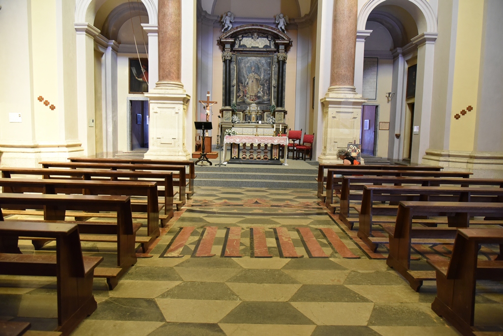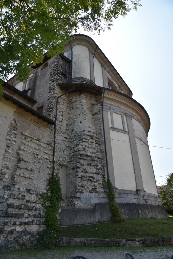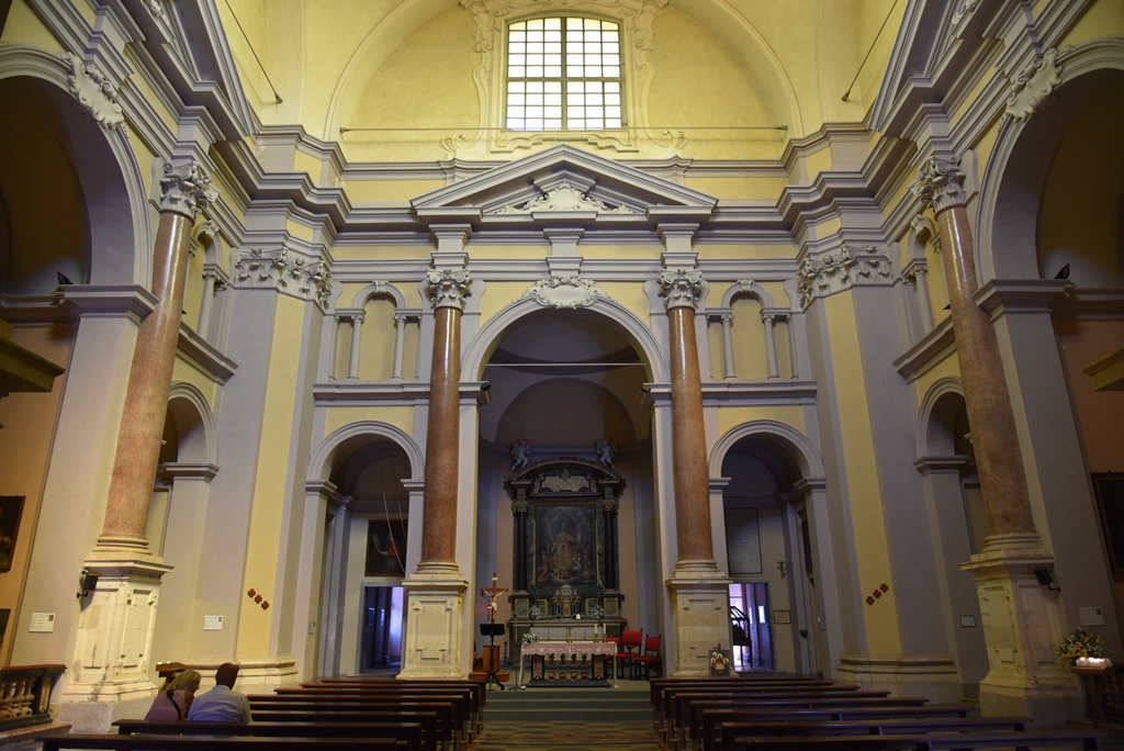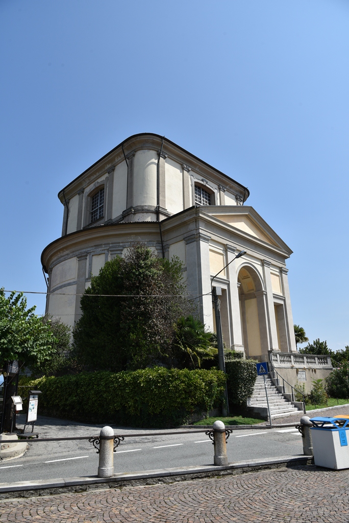 La Chiesa a pianta centrale è preceduta da due grandi scale laterali a sviluppo curvilineo convergenti verso il portico. Il vano centrale interno è coperto a cupola (dove è rappresentata la salita al cielo di San Carlo con i Santi Ambrogio e Simpliciano, affrescata dal Giussani) ed è alleggerito da profonde nicchie e cappelle con altari minori; il grande sviluppo verticale dell’invaso interno è sottolineato dalle altissime colonne in granito, montate su un dado e concluse da capitello composito; le colonne poste ai lati dei 3 fornici laterali maggiori (contenenti altari di squisita fattura), sostengono timpani a loro volta inseriti entro linee di cornice poste all’attacco della cupola. Oltre la zona absidale un corridoio immette nella sagrestia quadrata, coperta a padiglione e nella cosiddetta “camera di San Carlo” riproducente appunto la camera della Rocca ove nacque il Santo, l’ambiente, di impianto rettangolare, ha un elegante soffitto a cassettoni. Esternamente il corpo dell’edificio presenta un dichiarato impianto cruciforme con raccordi curvilinei nell’area absidale: le superfici sono caratterizzate dalla trattazione a bugnato liscio dei sotterranei e dalle finestre con cornice e timpano scandite da lesene joniche nella zona superiore. La cupola appare mascherata da un tamburo ad angoli smussati, alleggerito da grandi finestre e percorso da lesene joniche lisce montate su zoccolo, in parte assiali a quelle inferiori. La facciata è caratterizzata dall’atrio porticato neoclassico, al quale si accede mediante due scale curvilinee